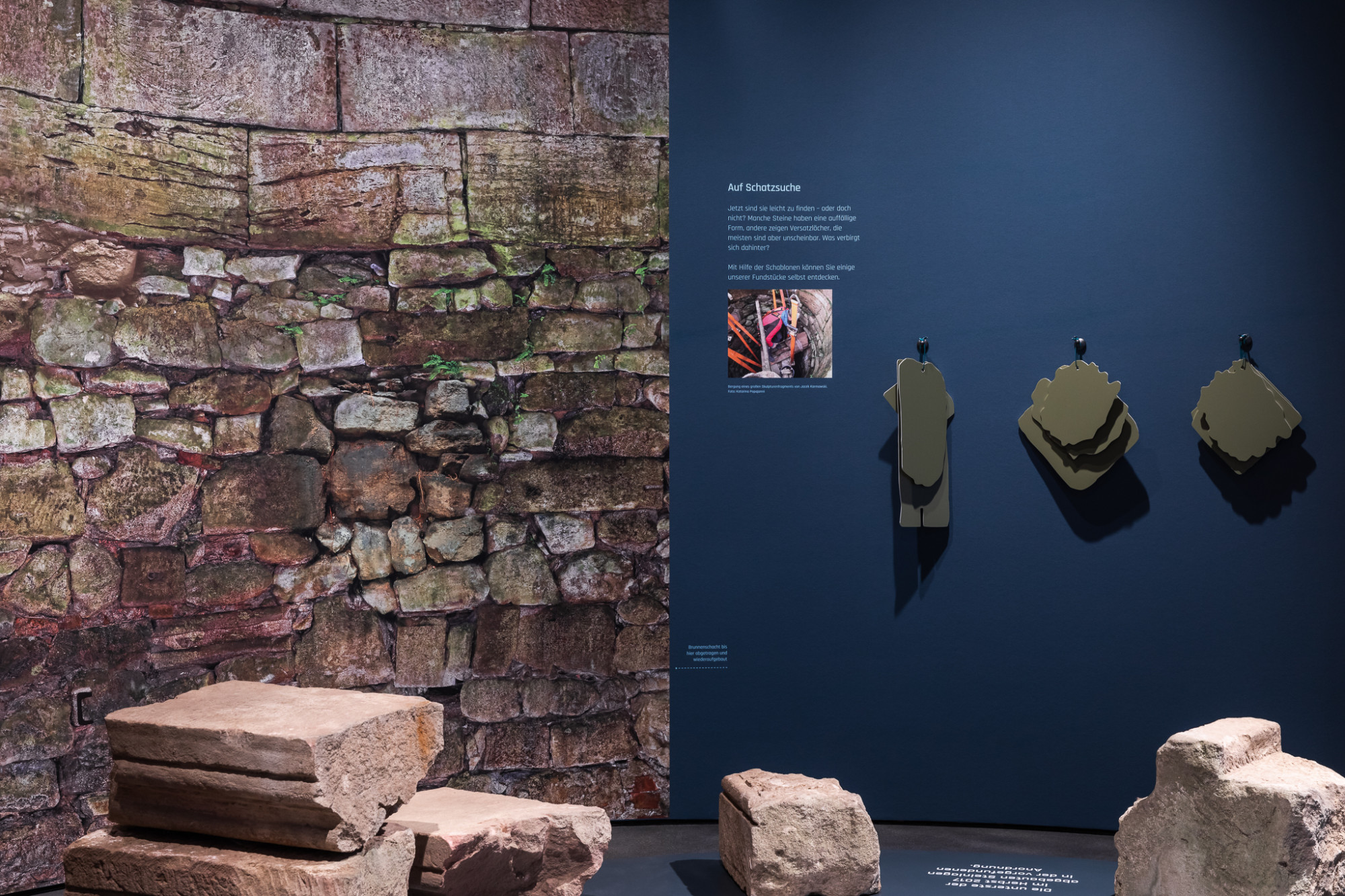 Die Ausstellungsarchitektur orientiert die sich im Grundriss an den Bogensegmenten eines Brunnens, die gebogenen Wände sind hintereinander gestaffelt. Im Zentrum befindet sich eine Projektion, in der die Besucher:innen das Abseilen in die Tiefe des Brunnens nachvollziehen können. Hierfür wurden Originalaufnahmen aus dem Brunneninneren zu einer Filmsequenz animiert.
