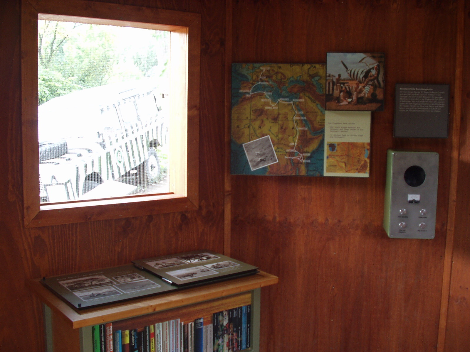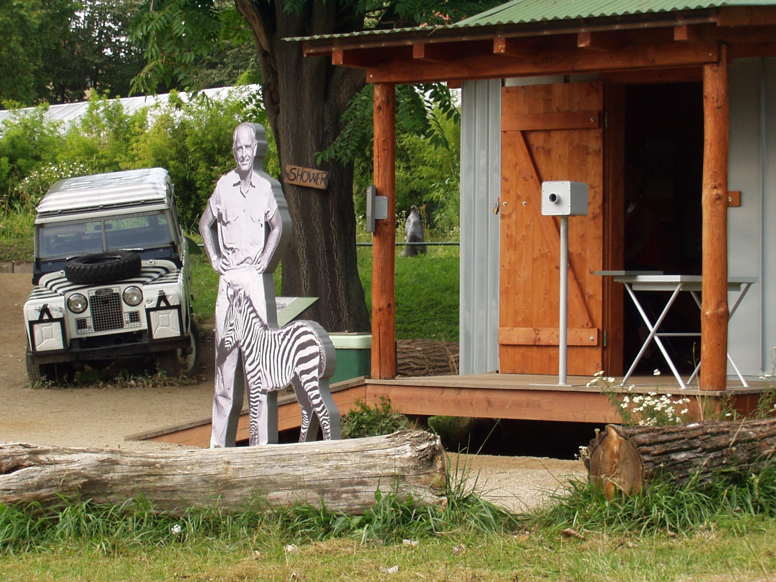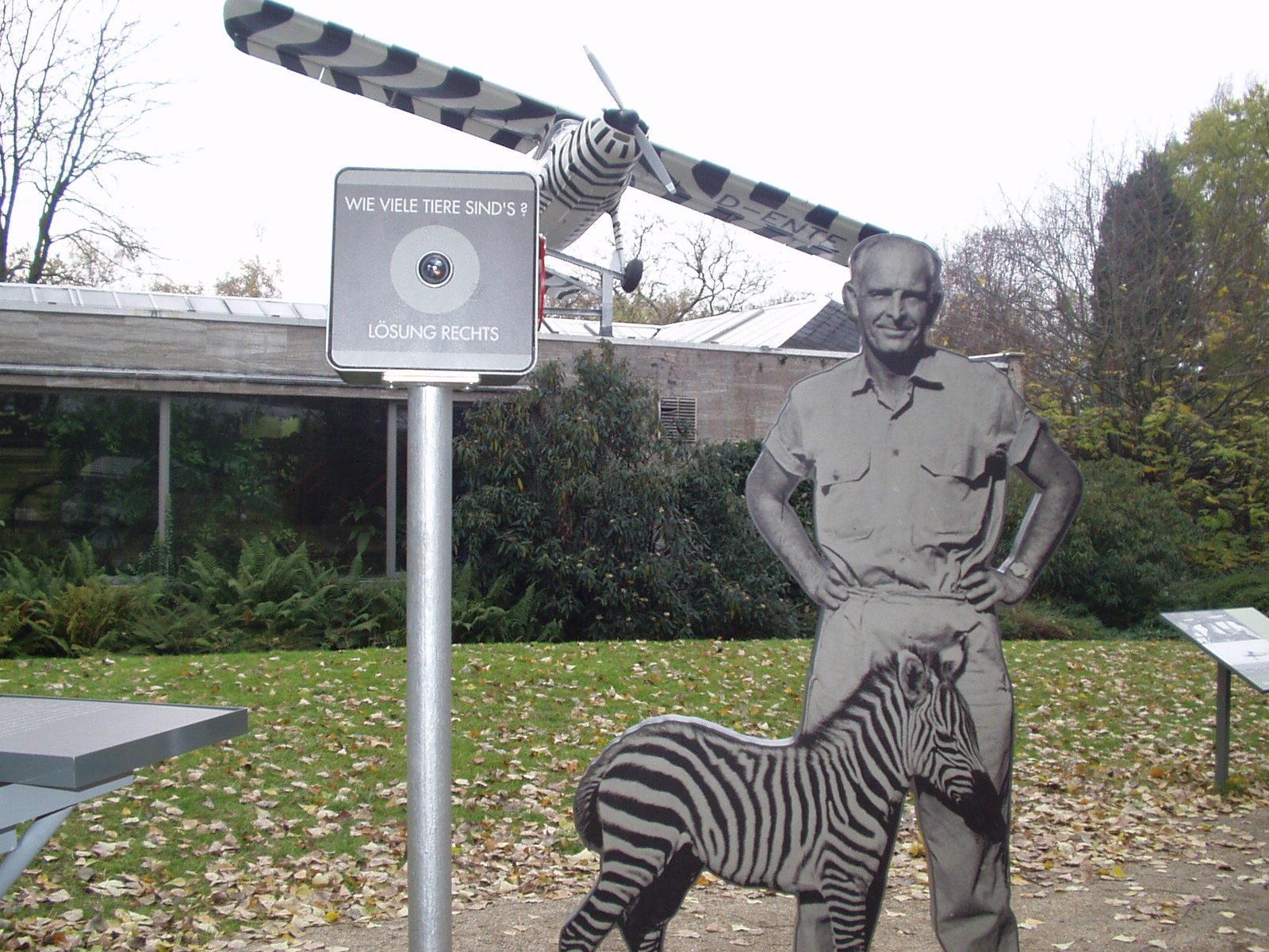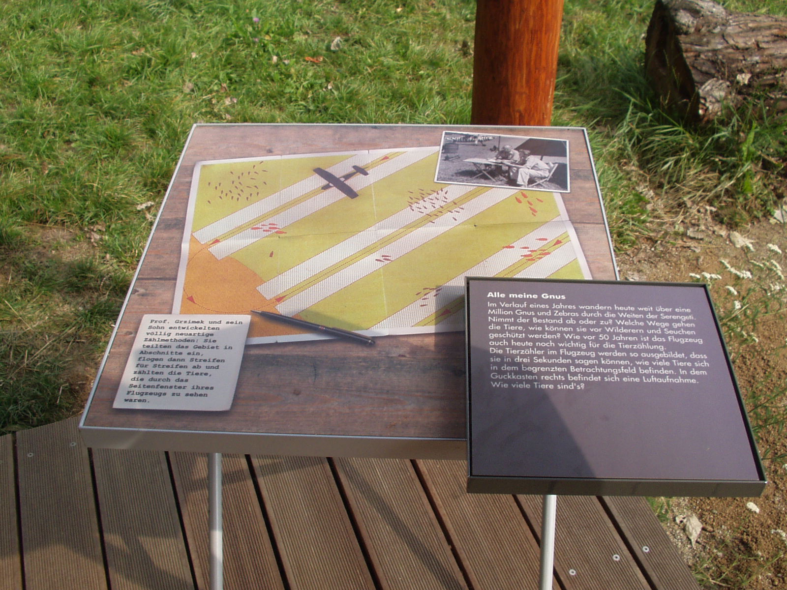 Die Person Bernhard Grzimeks und seine Verdienste für den Naturschutz sollen anhand einer inszenatorischen Dauerausstellung im Außenbereich (wieder) ins Bewusstsein gebracht werden. Ein Flugzeug gleichen Typs (DO 27), mit dem Grzimek und sein Sohn seinerzeit nach Afrika geflogen sind und ein Landrover, beide mit original Zebrastreifen lackiert, sowie eine zeltartige Hütte im afrikanischen Stil, bilden die zentralen Elemente für die Nachempfindung einer Camp-Situation in der Serengeti. Informationen über die wegweisenden Naturschutzaktivitäten vor allem in Ostafrika, Grzimeks visionäres Engagement für die Zoologische Gesellschaft Frankfurt sowie seine Verdienste für den Wiederaufbau des Frankfurter Zoos werden in erster Linie über Bilder, interaktive Elemente und Hörstationen vermittelt. Eine besondere Herausforderung bestand darin, das Flugzeug auf das Dach des Affenhauses zu heben und dort zu montieren.