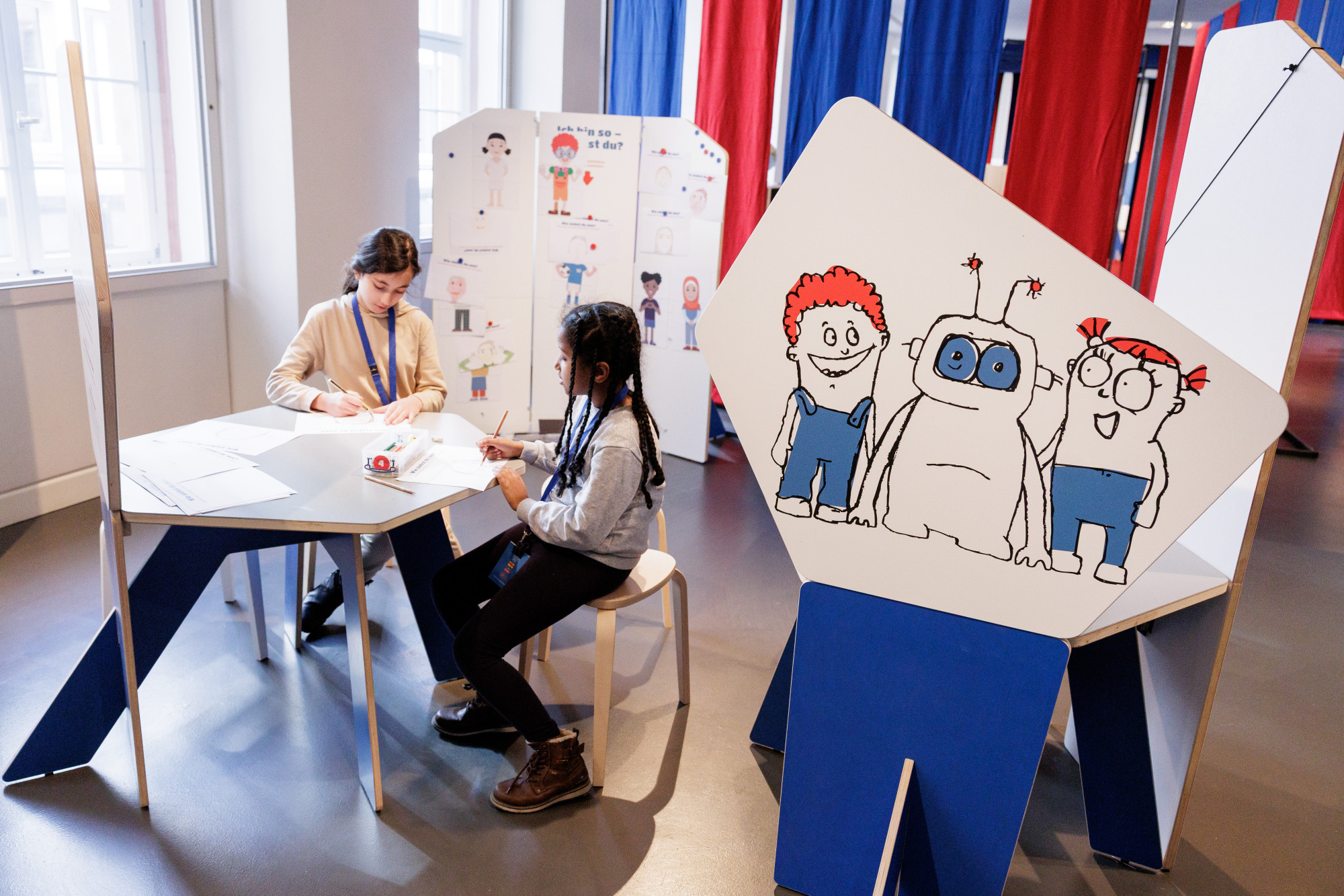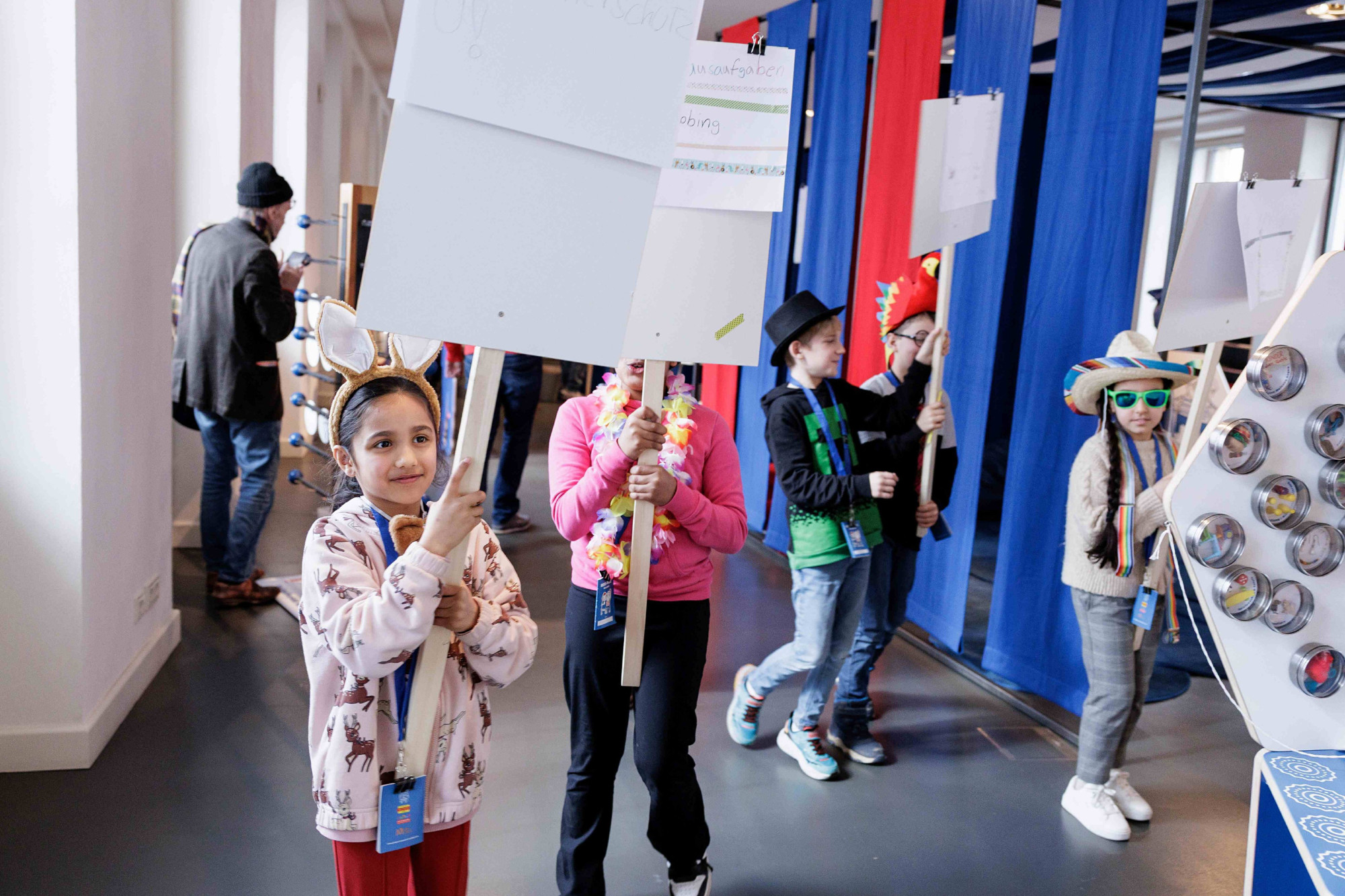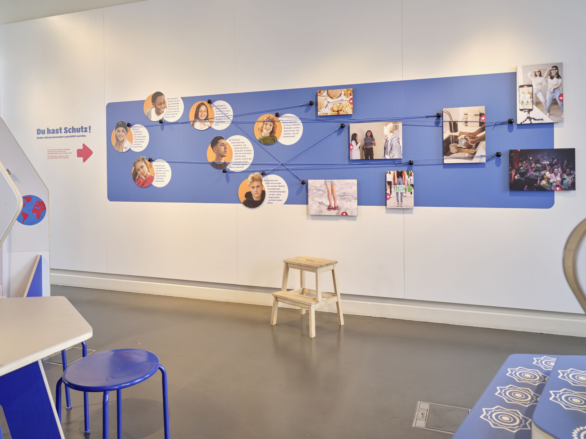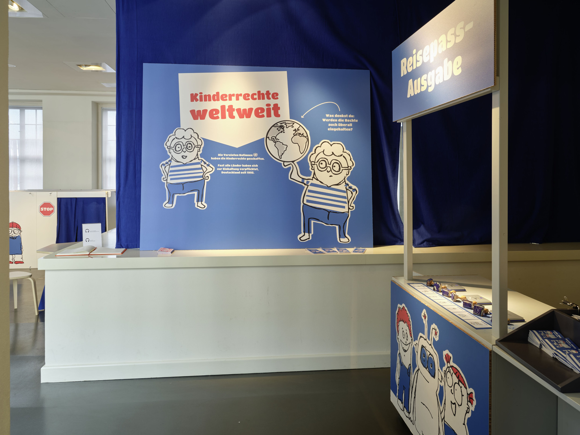 Die interaktive Ausstellung zu den Kinderrechten wurde im Auftrag des Kinderbüros zunächst als Wanderausstellung konzipiert und gestaltet. Die Stationen bestehen aus mobilen Elementen, die sich innerhalb eines halben Tages auf- oder abbauen lassen. Für eine Präsentation im Jungen Museum wurde die Ausstellung um ein Forum sowie durch weitere Stationen erweitert. Um die Raumakustik zu verbessern und die inhaltlichen Stationen zu struktieren, wurden Raumtrenner mit Textilbahnen eingebracht.