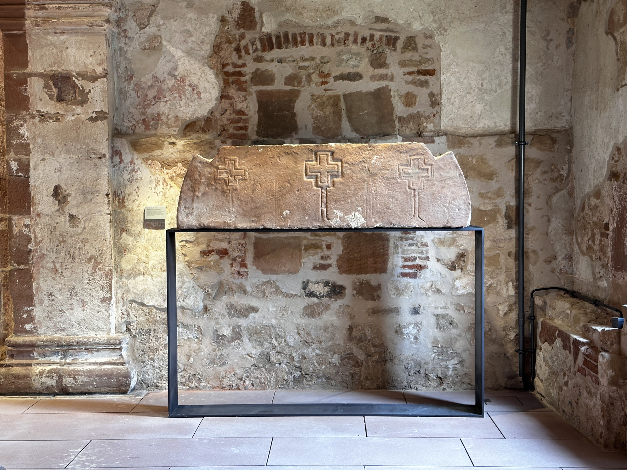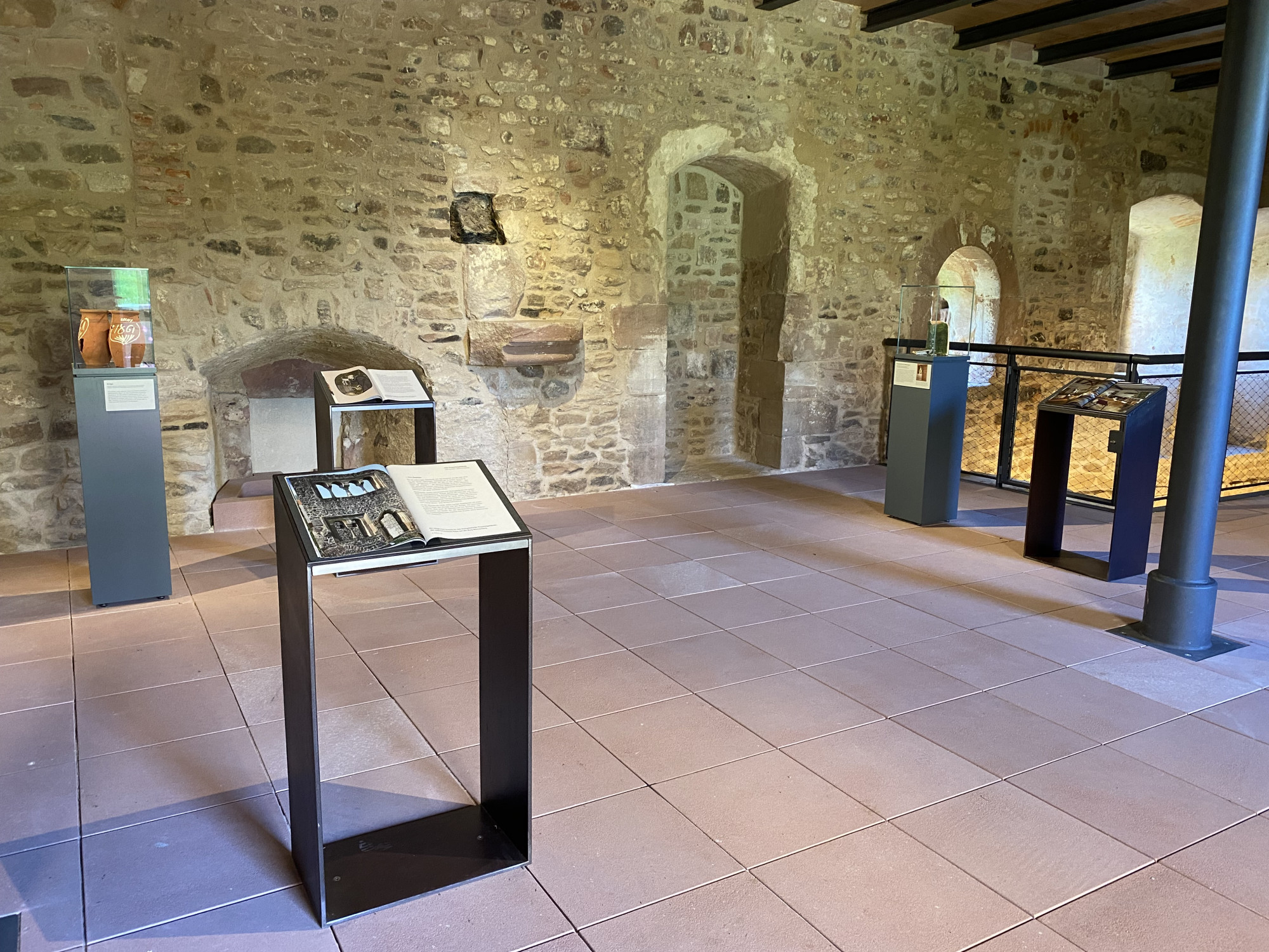 Um die faszinierende Geschichte dieses besonderen Ortes zu erzählen und die während der Restaurierungsarbeiten entdeckten Fundstücke zu präsentieren, wurden dezente Präsentationselemente entwickelt. Diese lassen die Räume mit ihrer besonderen Aura wirken. Rahmenartige Stahlelemente dienen dabei sowohl als Lesepulte als auch als tragende Strukturen für Steinobjekte und Vitrinen.