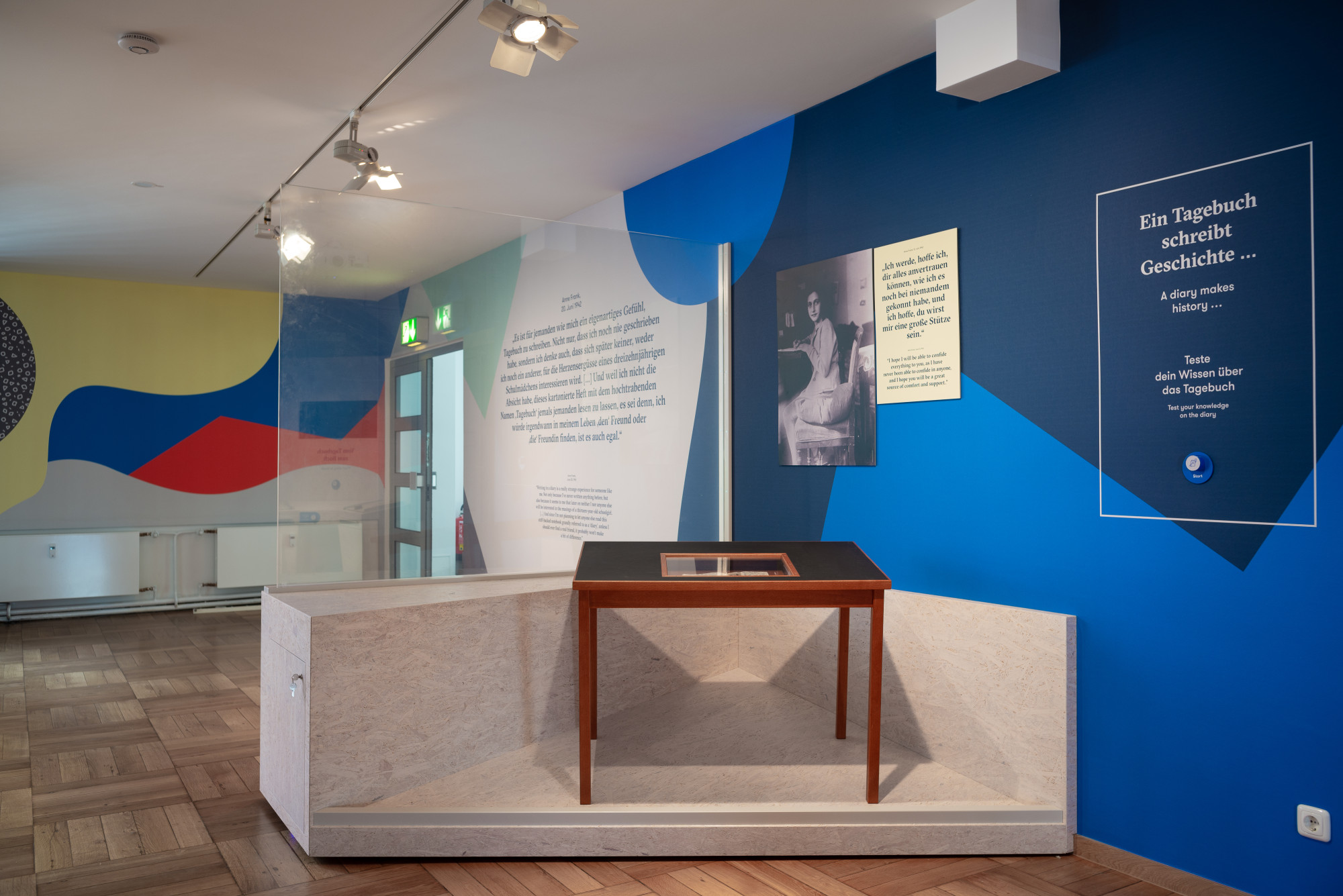 Bei der Gestaltung stand im Vordergrund, eine freundliche und offene Atmosphäre zu schaffen, die dazu einlädt, sich auch mit den komplexen und teilweise herausfordernden Inhalten auseinanderzusetzen. Die Ausstellungsarchitektur besteht aus hell lasierten Holzkuben, die je nach Umfang zu thematischen Inseln zusammengestellt sind. Großflächige, expressive Wandgrafiken rahmen den Raum ein und dienen teilweise als Hintergrund für Informationen, etwa zur Geschichte der Familie Frank.