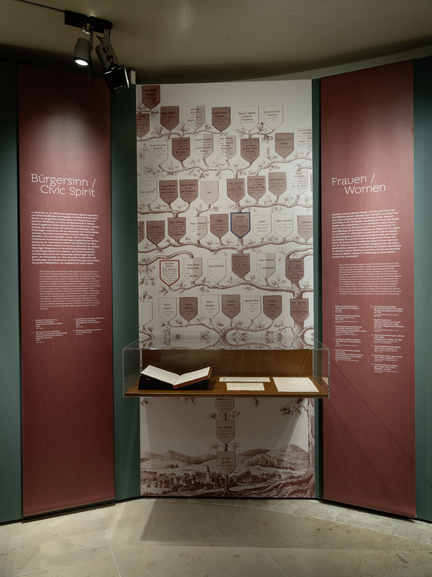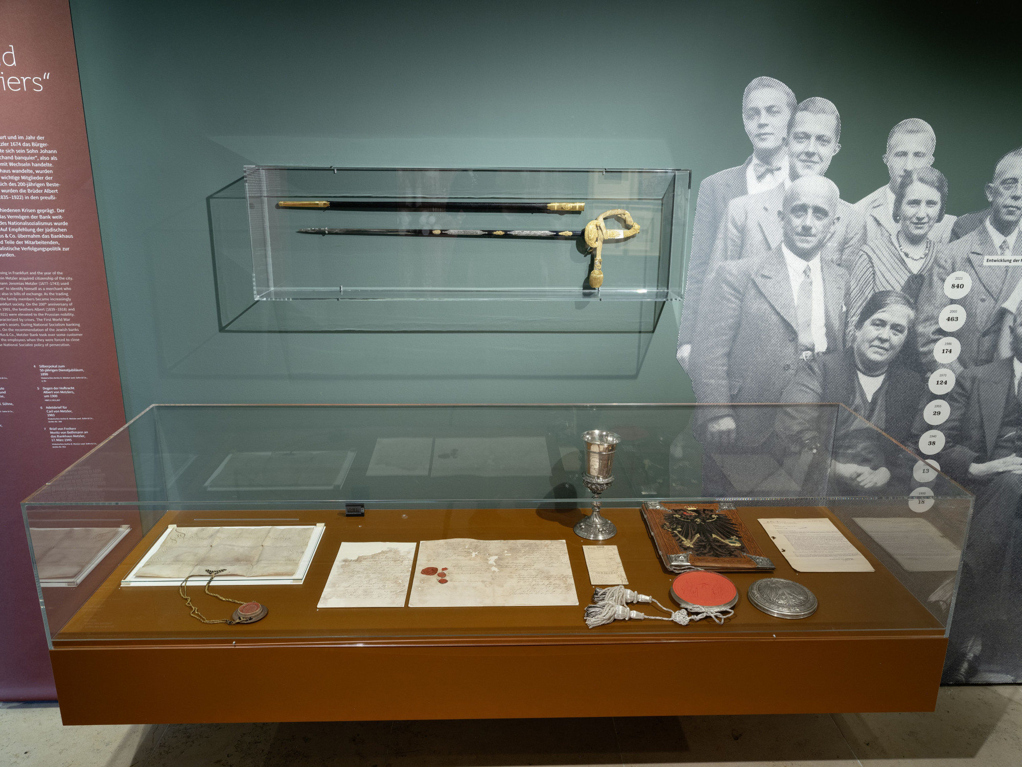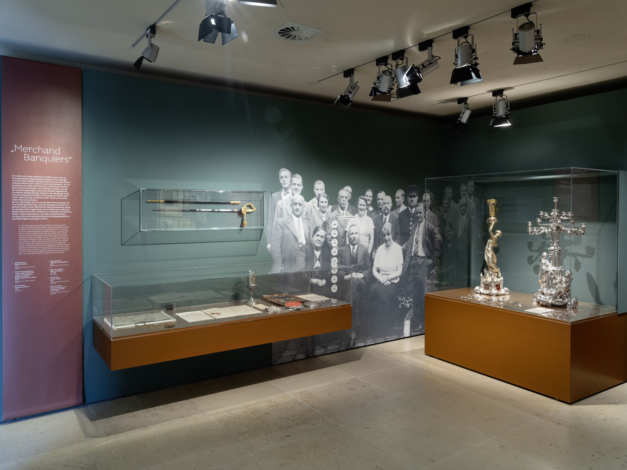 Die Kabinett-Ausstellung im 13. Sammlerraum zeichnet mit bisher nie gezeigten Objekten aus dem Firmenarchiv und der Sammlung des Museums eindrücklich 350 Jahre Firmengeschichte nach: Über Krisen und Kriege, die erste weibliche Bankerin Frankfurts und die Entwicklung des Bankenbetriebs, von Staatsanleihen bis zur Finanzdienstleistung und Vermögensverwaltung.