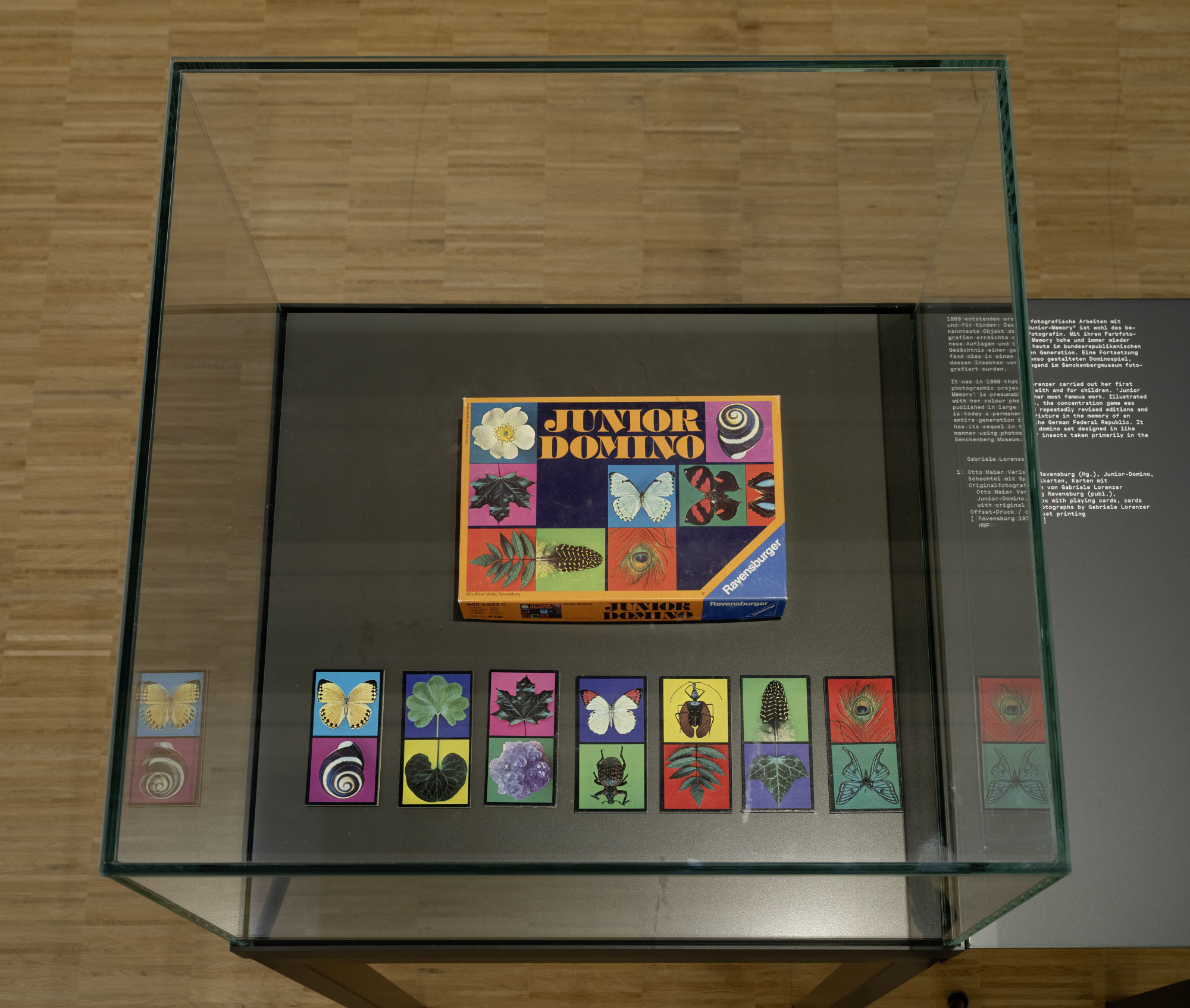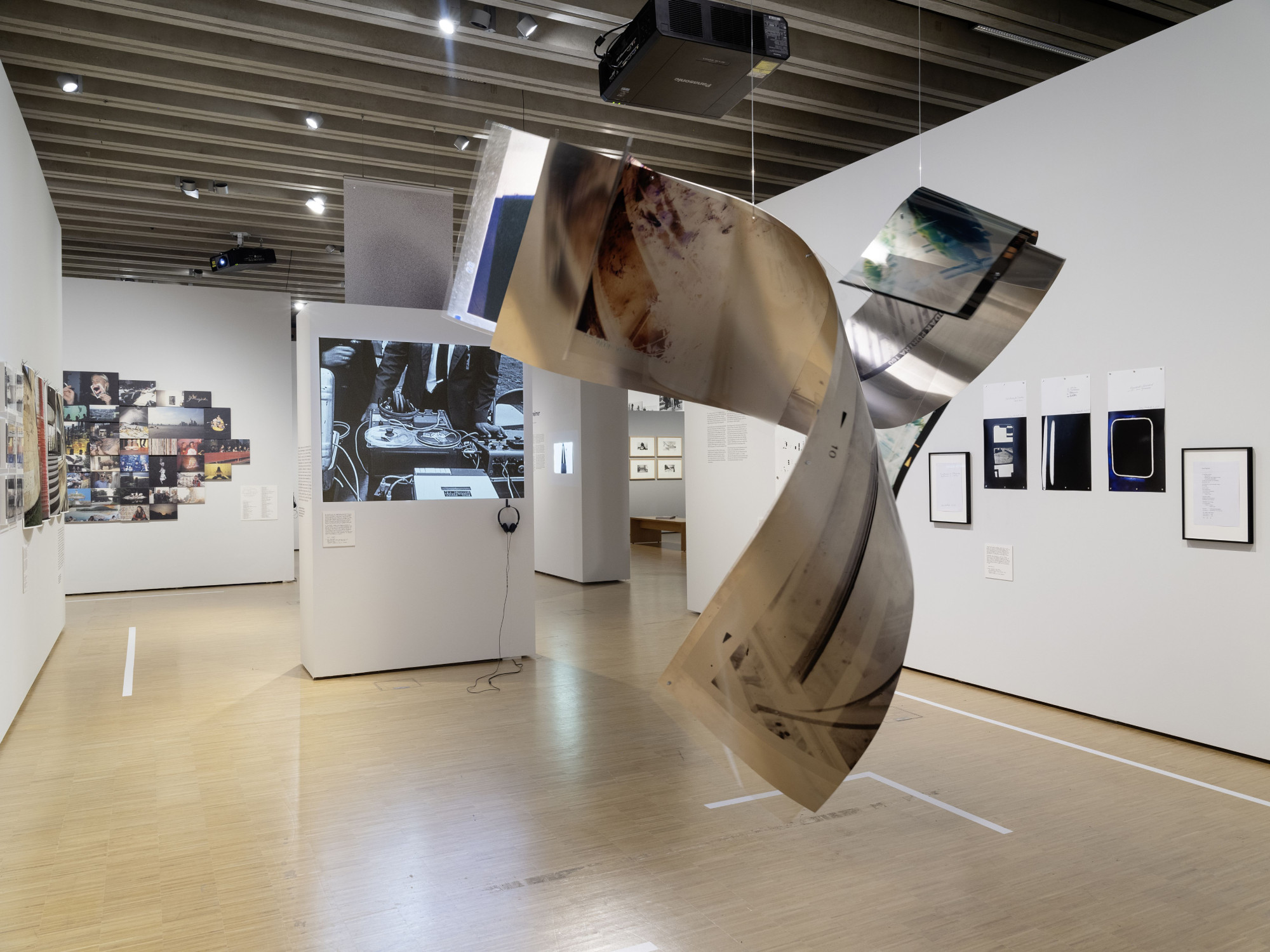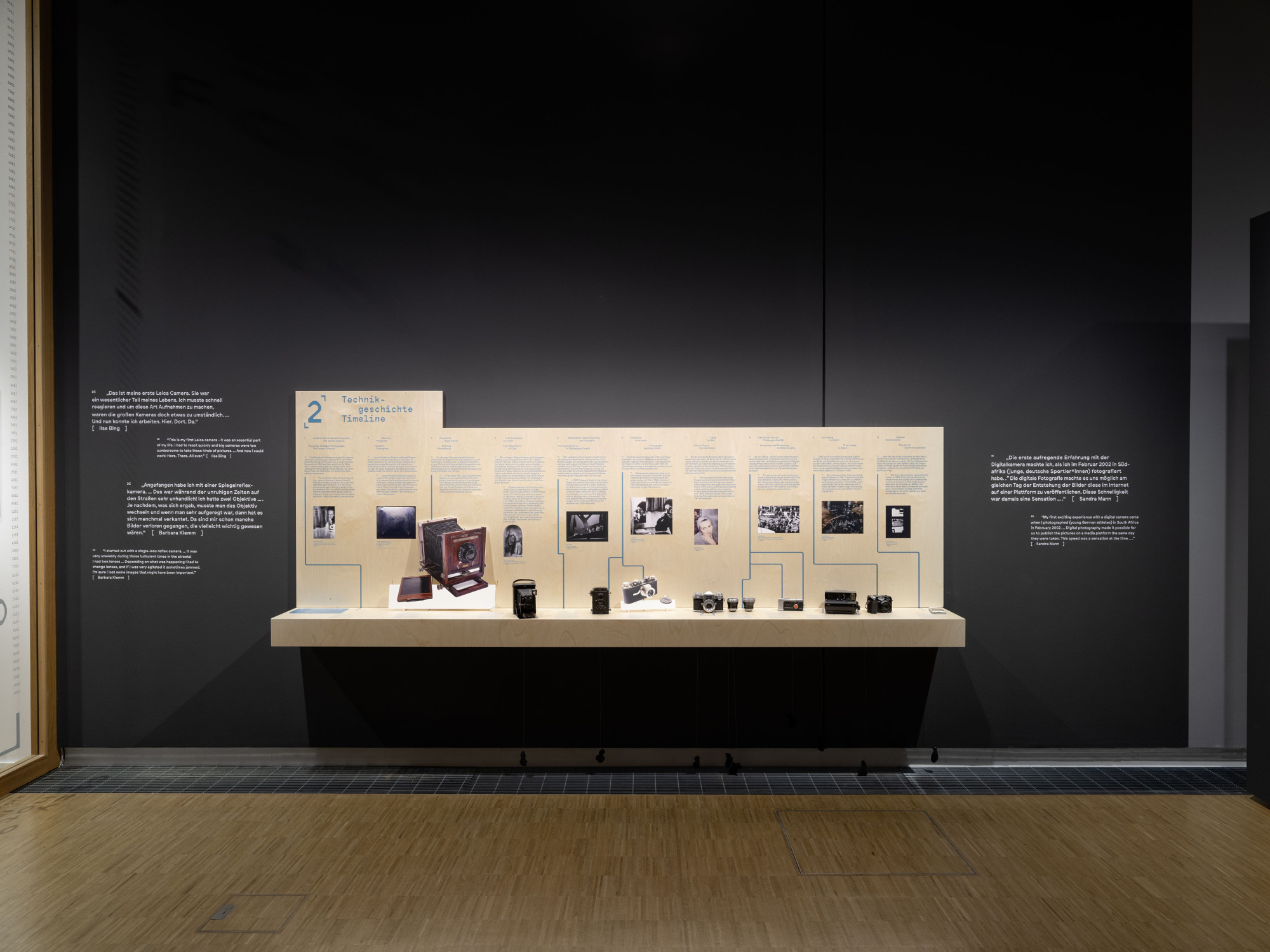Die Vermittlungsspur, die verschiedene Aspekte der Fotografie durch interaktive Stationen erlebbar macht, hebt sich durch ihre eigene Materialität hervor: Die baulichen Elemente sind aus hellem Holz gefertigt und mit farbiger Schrift sowie farbigen grafischen Elementen bedruckt. Dieser Kontrast schafft eine reizvolle Ergänzung zur klaren Architektur der Ausstellung.