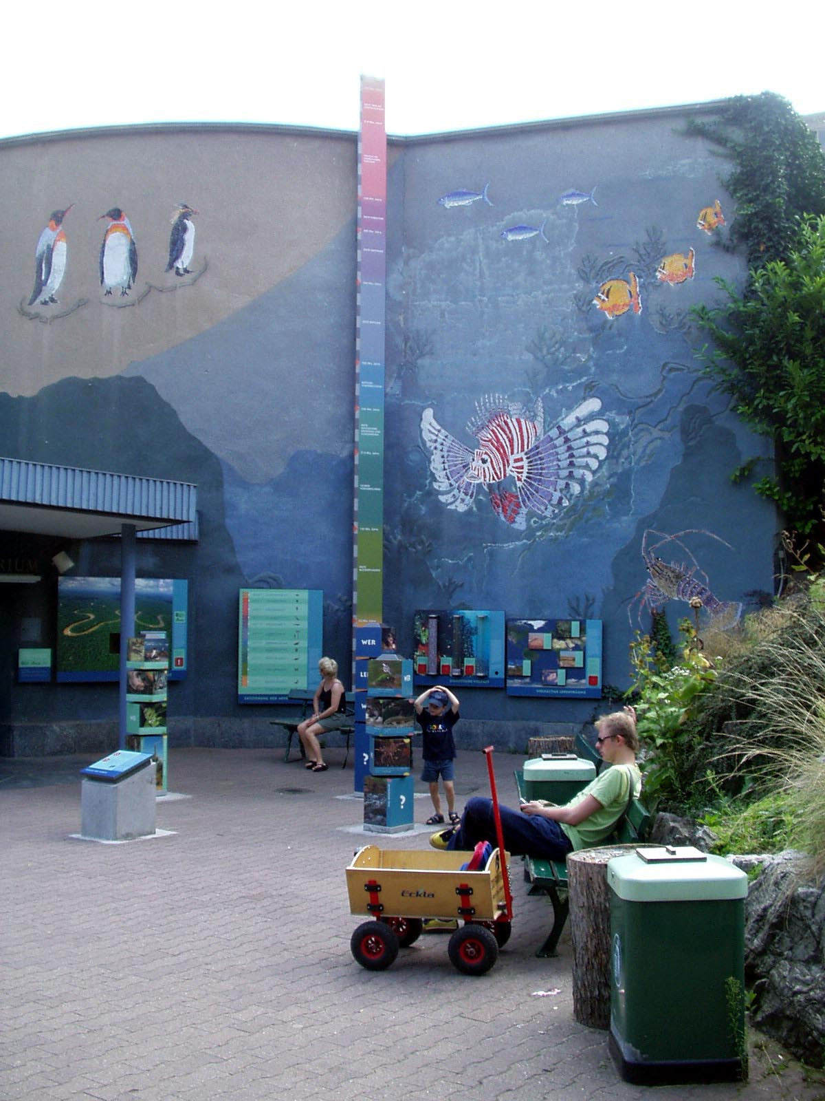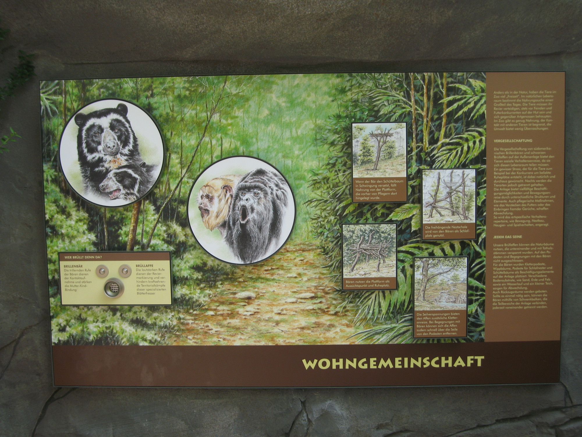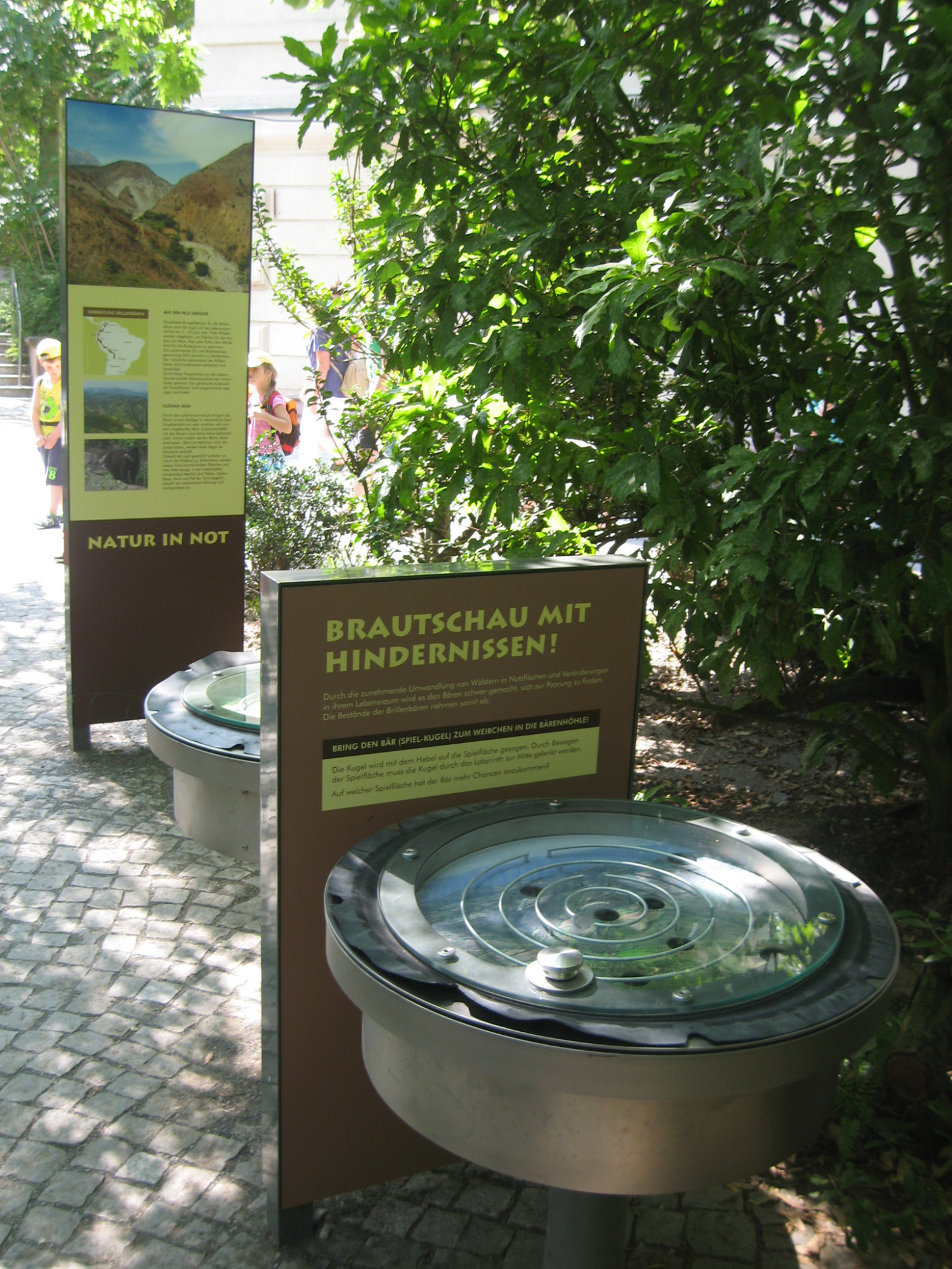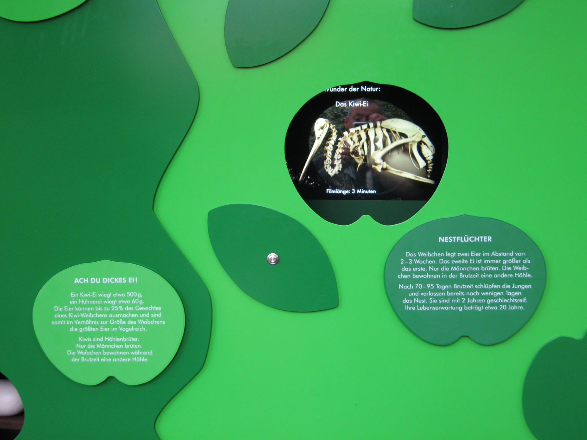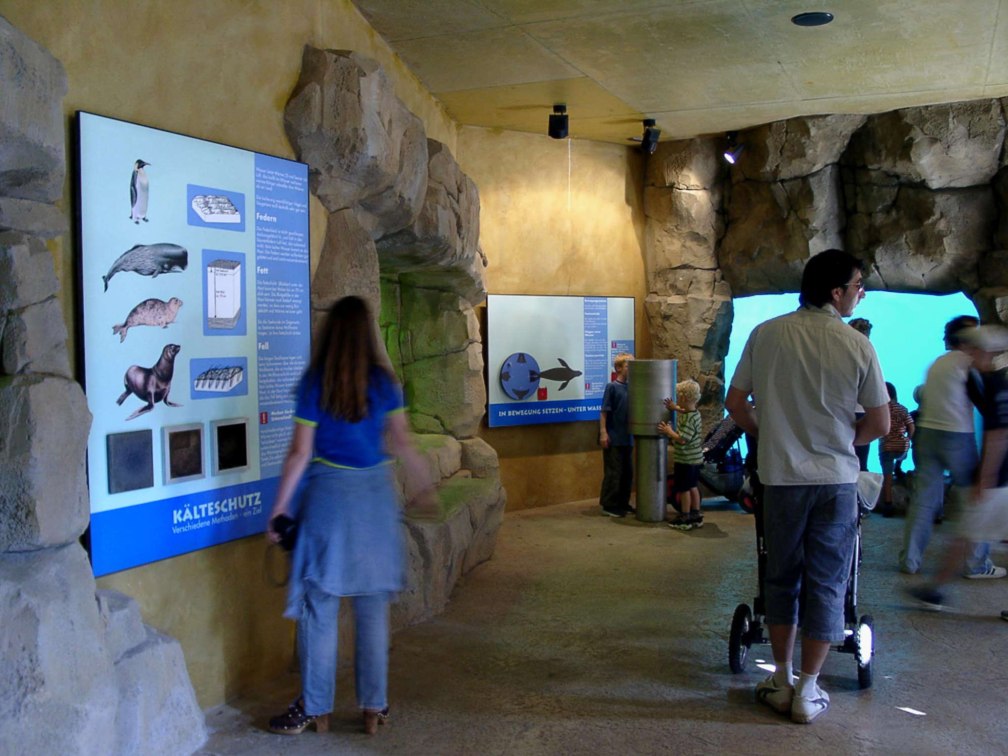 Seit dem Jahr 2000 haben wir gemeinsam mit der Zoopädagogin ein Informationssystem für den Zoo Frankfurt entwickelt. Es umfasst Tafeln, die über den Körperbau, das Verhalten und die Lebensräume der Tiere sowie über Naturschutzthemen informieren. Die Tafeln werden mit interaktiven Objekten kombiniert, die komplexe Zusammenhänge auf spielerische Weise veranschaulichen. Die Besucher:innen können konkrete sinnliche Erfahrungen sammeln und anhand kleiner eigener Experimente Antworten auf gestellte Fragen finden.