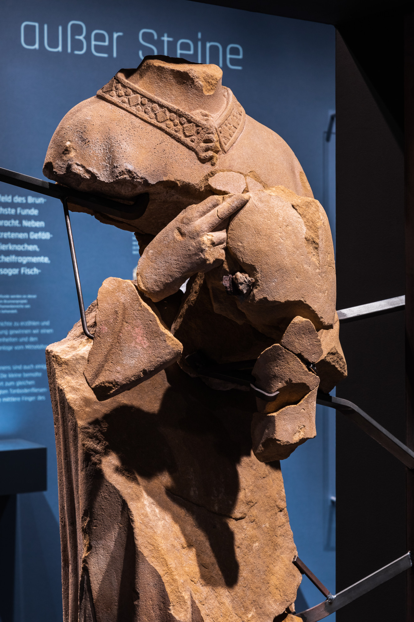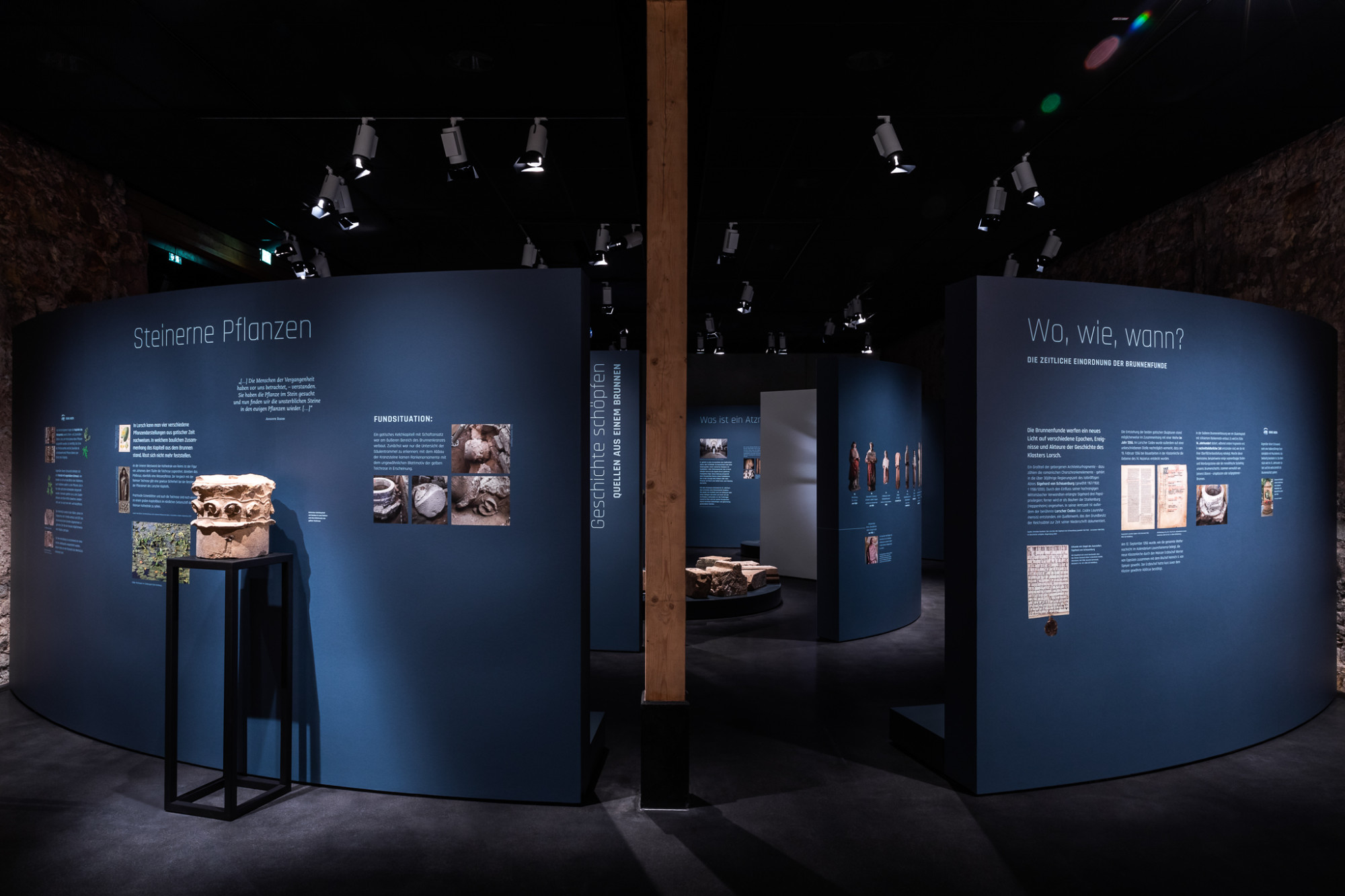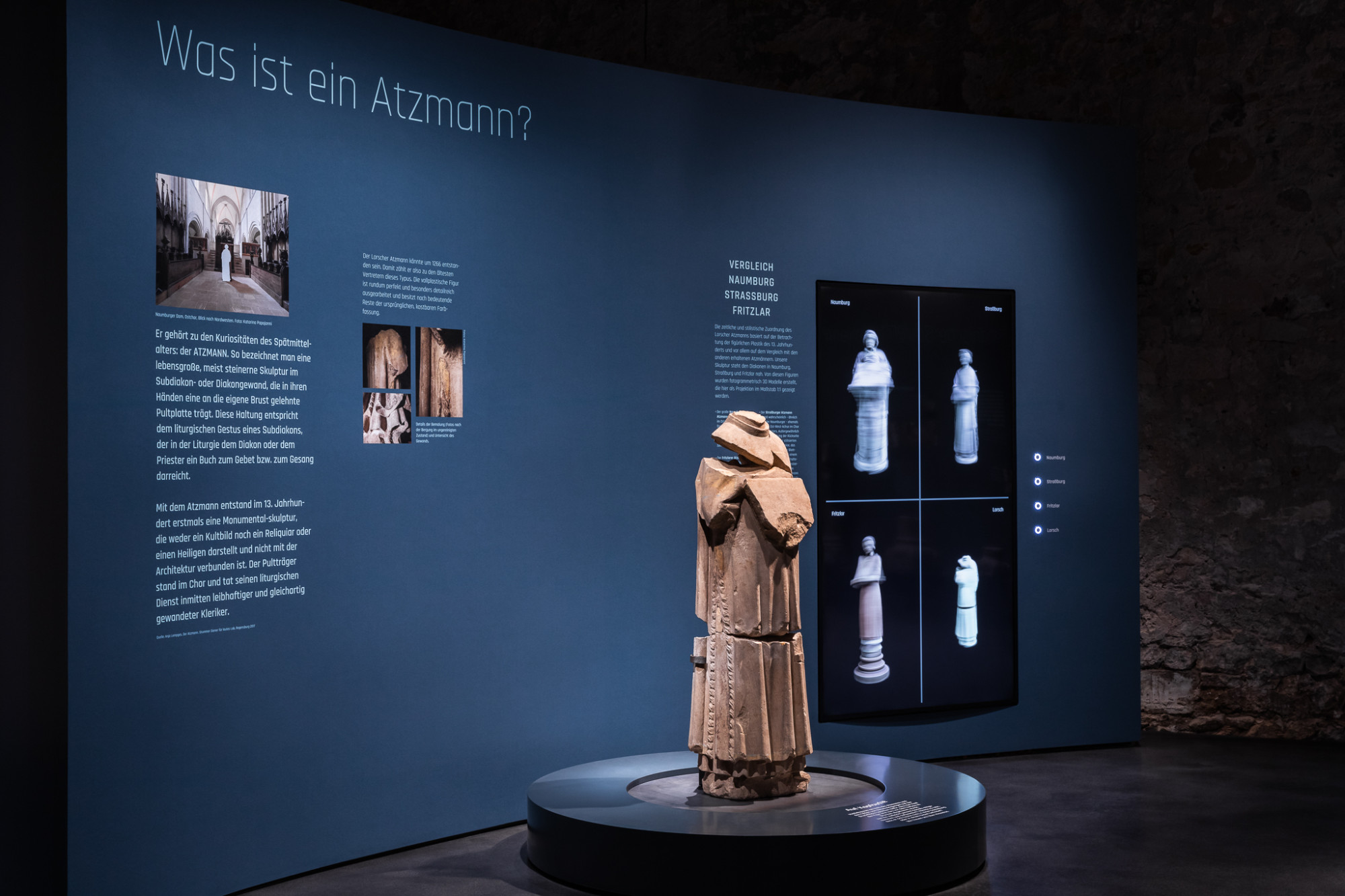 In einem Brunnen auf dem Gelände des einstmals bedeutenden Klosters Lorsch (heute Weltkulturerbe) wurden Fragmente von Steinskulpturen und Architekturelemente entdeckt, die dort vermauert waren. Diese Funde bilden den Ausgangspunkt für eine Ausstellung, die die Geschichte der Auffindung und Bergung erzählt sowie der Bedeutung der Steinskulpturen und der Architekturfragmente nachgeht. Neben Säulen- und Chorschrankenfragmenten sind es vor allem die Figurenfragmente, die zunächst Rätsel aufgeben und sich im Verlauf der Erforschung als sogenannte Atzmänner herausstellen, Statuen, oft in Menschengestalt gearbeitet, die dazu dienten, liturgische Bücher zu halten. Die Fragmente dieser Statuen wurden aufwändig zu Figuren rekonstruiert und die inhaltlichen Zusammenhänge sowohl medial als auch grafisch aufbereitet.