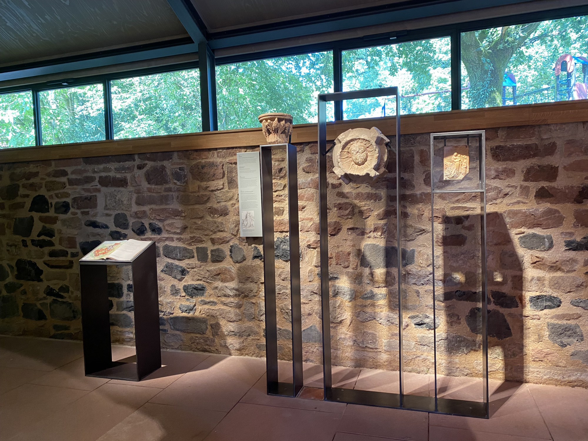 Um die faszinierende Geschichte dieses besonderen Ortes zu erzählen und die während der Restaurierungsarbeiten entdeckten Fundstücke zu präsentieren, wurden dezente Präsentationselemente entwickelt. Diese lassen die Räume mit ihrer besonderen Aura wirken. Rahmenartige Stahlelemente dienen dabei sowohl als Lesepulte als auch als tragende Strukturen für Steinobjekte und Vitrinen.