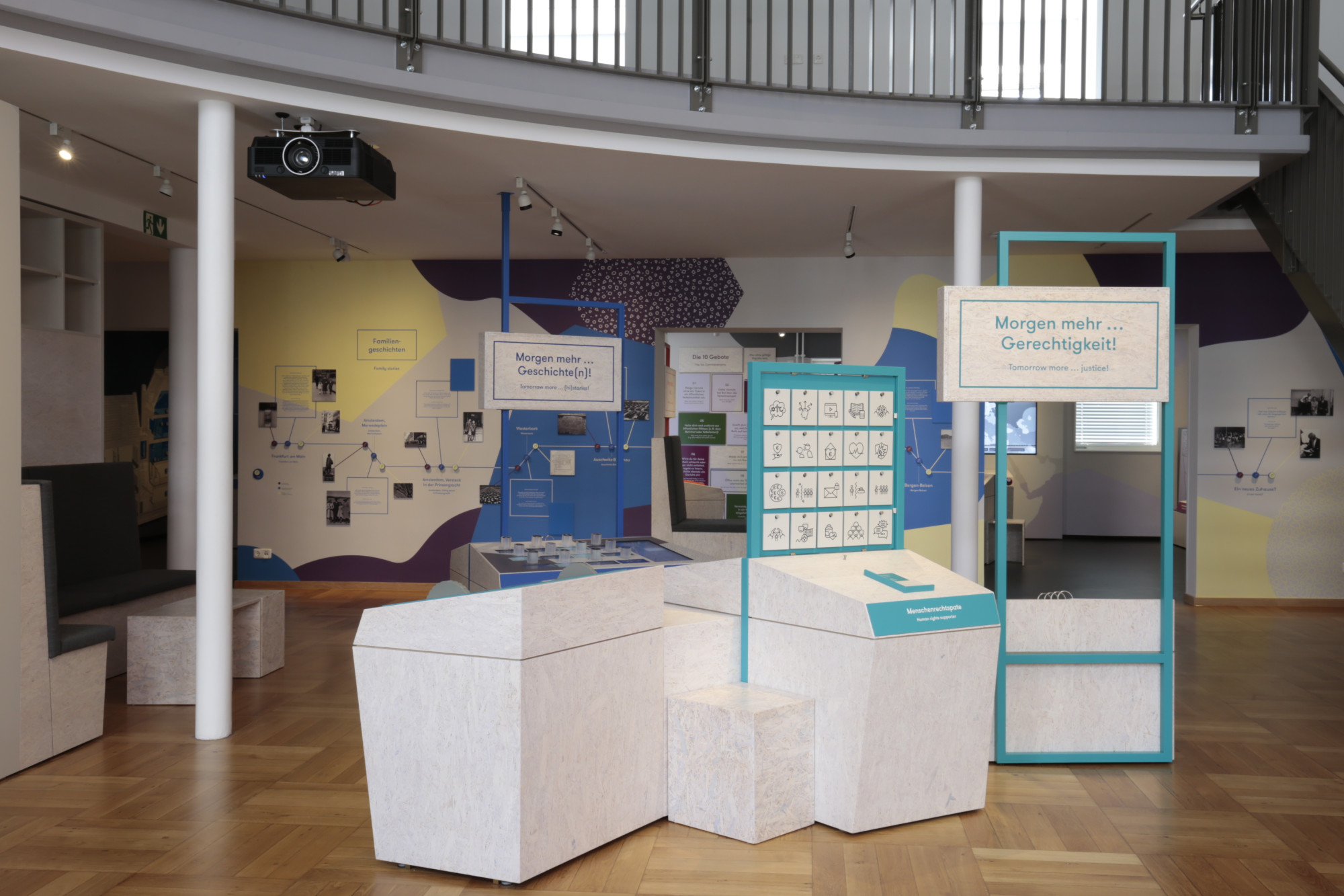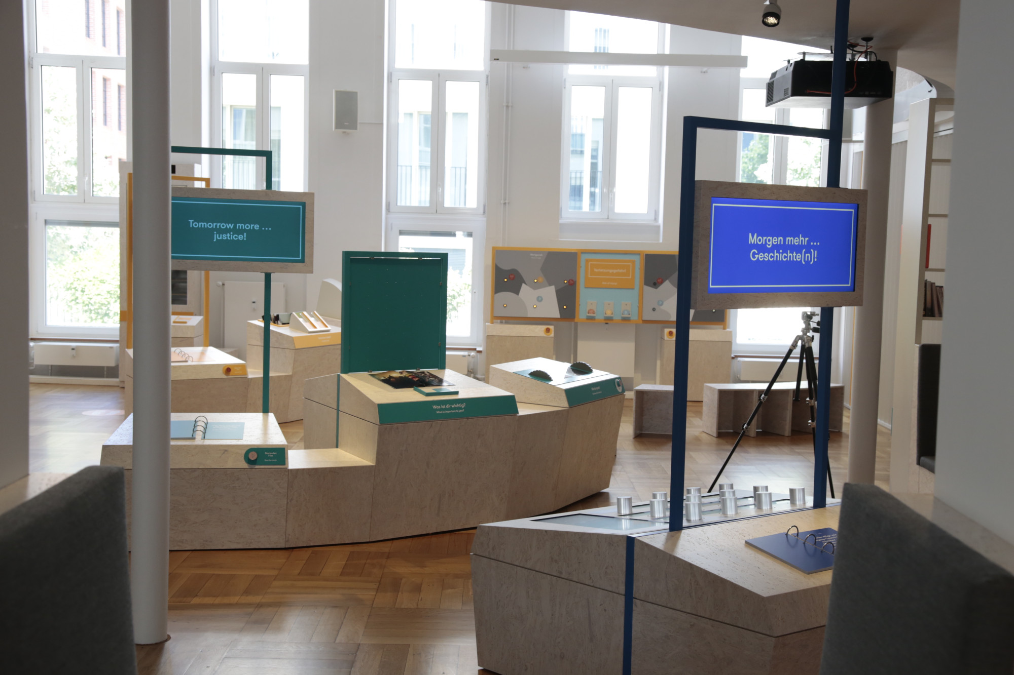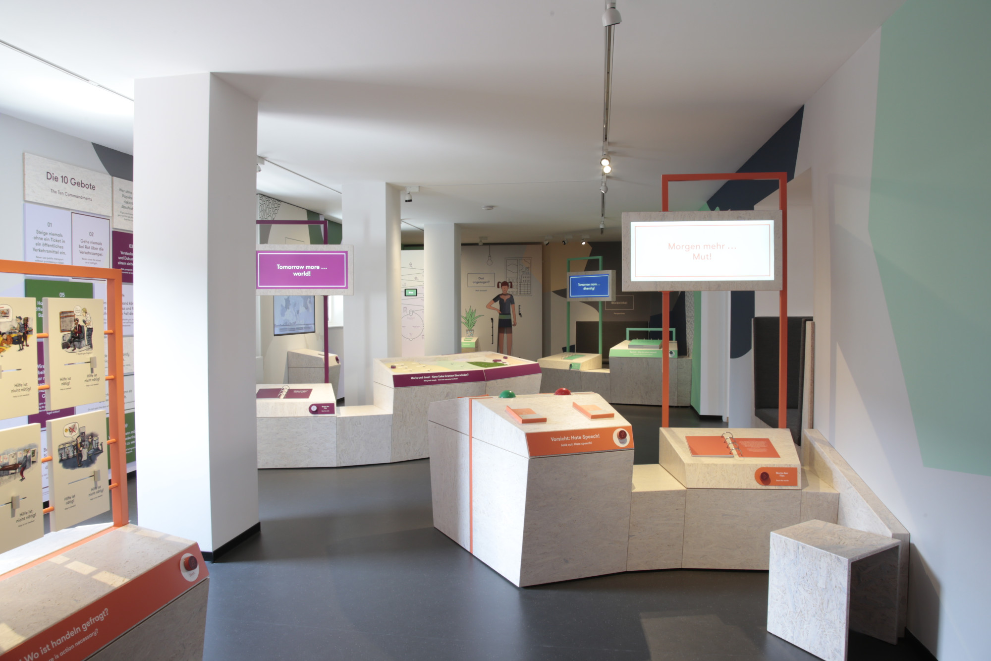 Die Ausstellung ist speziell für Gruppen, wie beispielsweise Schulklassen, konzipiert. Zu Beginn erhalten sie ein Tablet, mit dem sie die Ausstellung erkunden, interaktive Elemente auslösen und vertiefende Informationen abrufen können. Kurze Filmsequenzen, Fragestellungen und Bildcollagen führen in die verschiedenen Themeninseln wie „Morgen mehr Mut“ oder „Morgen mehr Welt“ ein.