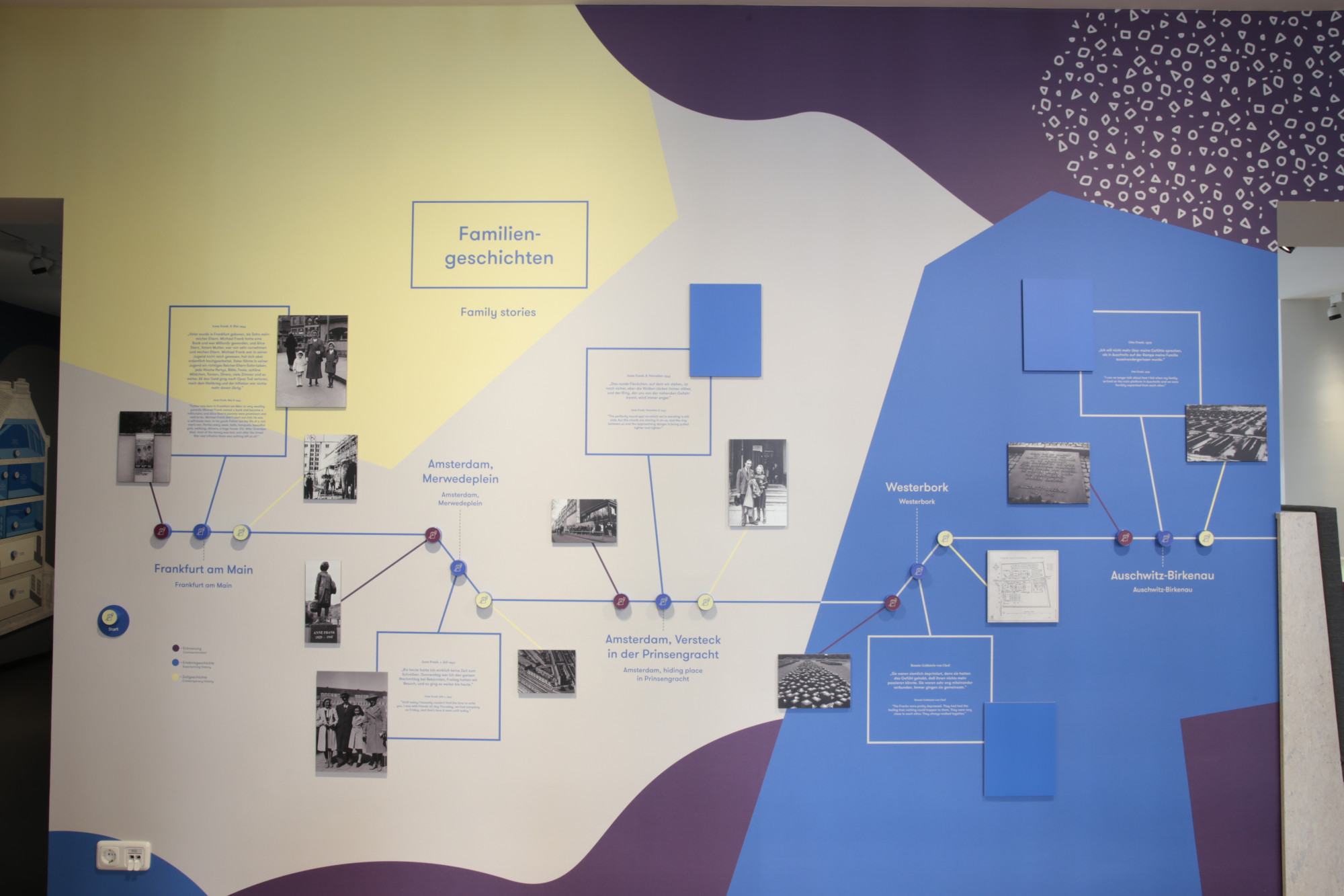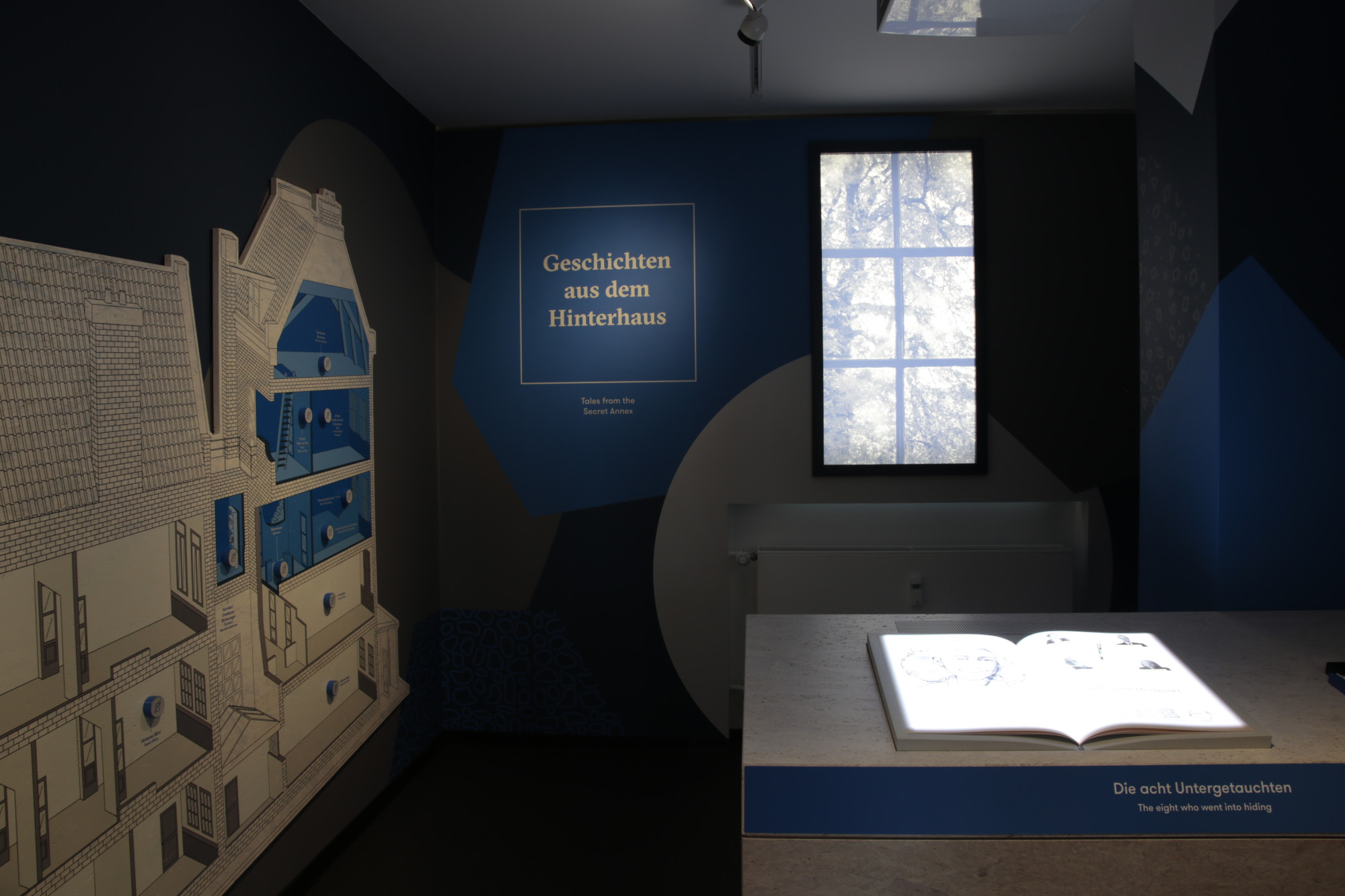 Bei der Gestaltung stand im Vordergrund, eine freundliche und offene Atmosphäre zu schaffen, die dazu einlädt, sich auch mit den komplexen und teilweise herausfordernden Inhalten auseinanderzusetzen. Die Ausstellungsarchitektur besteht aus hell lasierten Holzkuben, die je nach Umfang zu thematischen Inseln zusammengestellt sind. Großflächige, expressive Wandgrafiken rahmen den Raum ein und dienen teilweise als Hintergrund für Informationen, etwa zur Geschichte der Familie Frank.