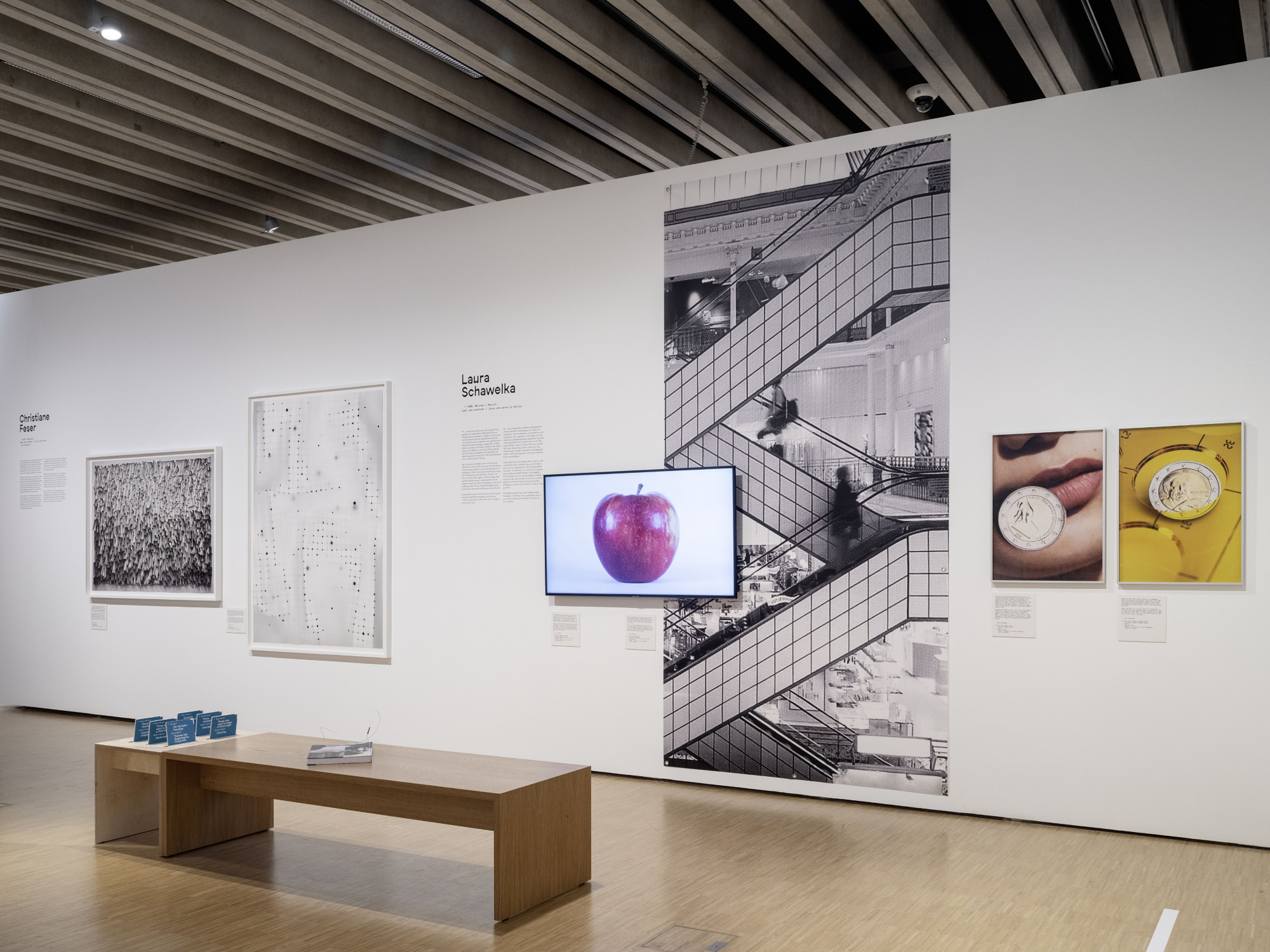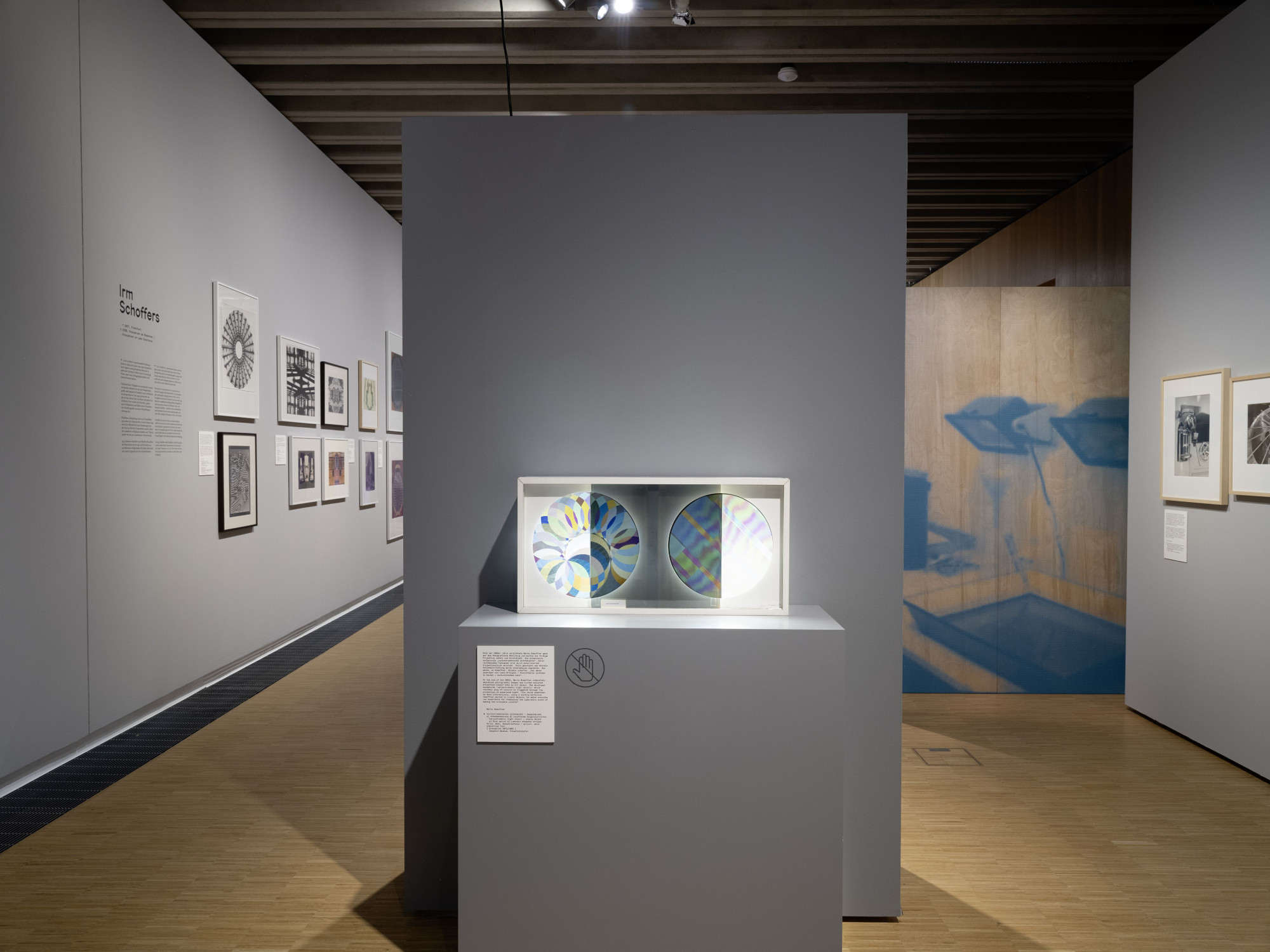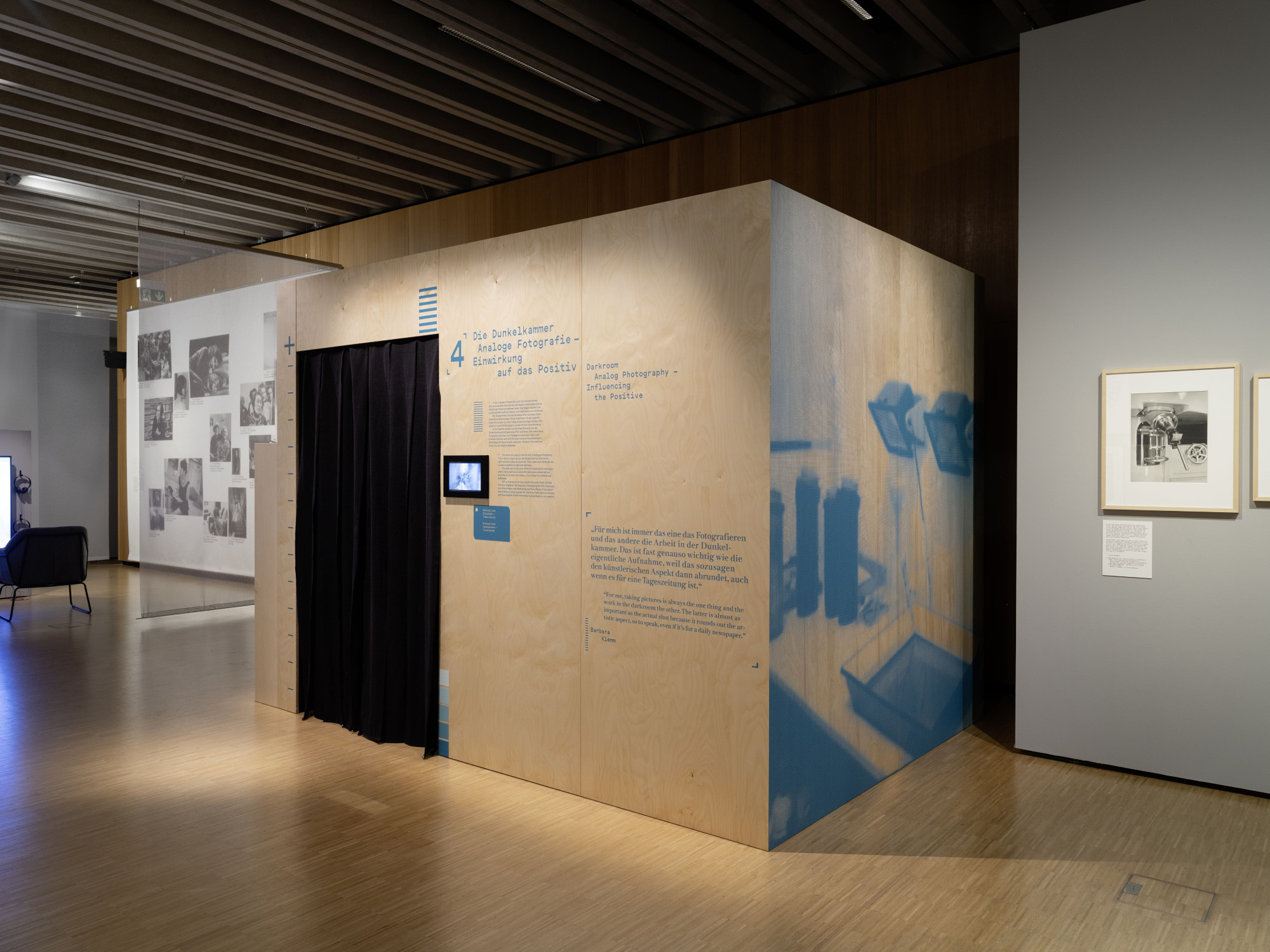 Die Vermittlungsspur, die verschiedene Aspekte der Fotografie durch interaktive Stationen erlebbar macht, hebt sich durch ihre eigene Materialität hervor: Die baulichen Elemente sind aus hellem Holz gefertigt und mit farbiger Schrift sowie farbigen grafischen Elementen bedruckt. Dieser Kontrast schafft eine reizvolle Ergänzung zur klaren Architektur der Ausstellung.