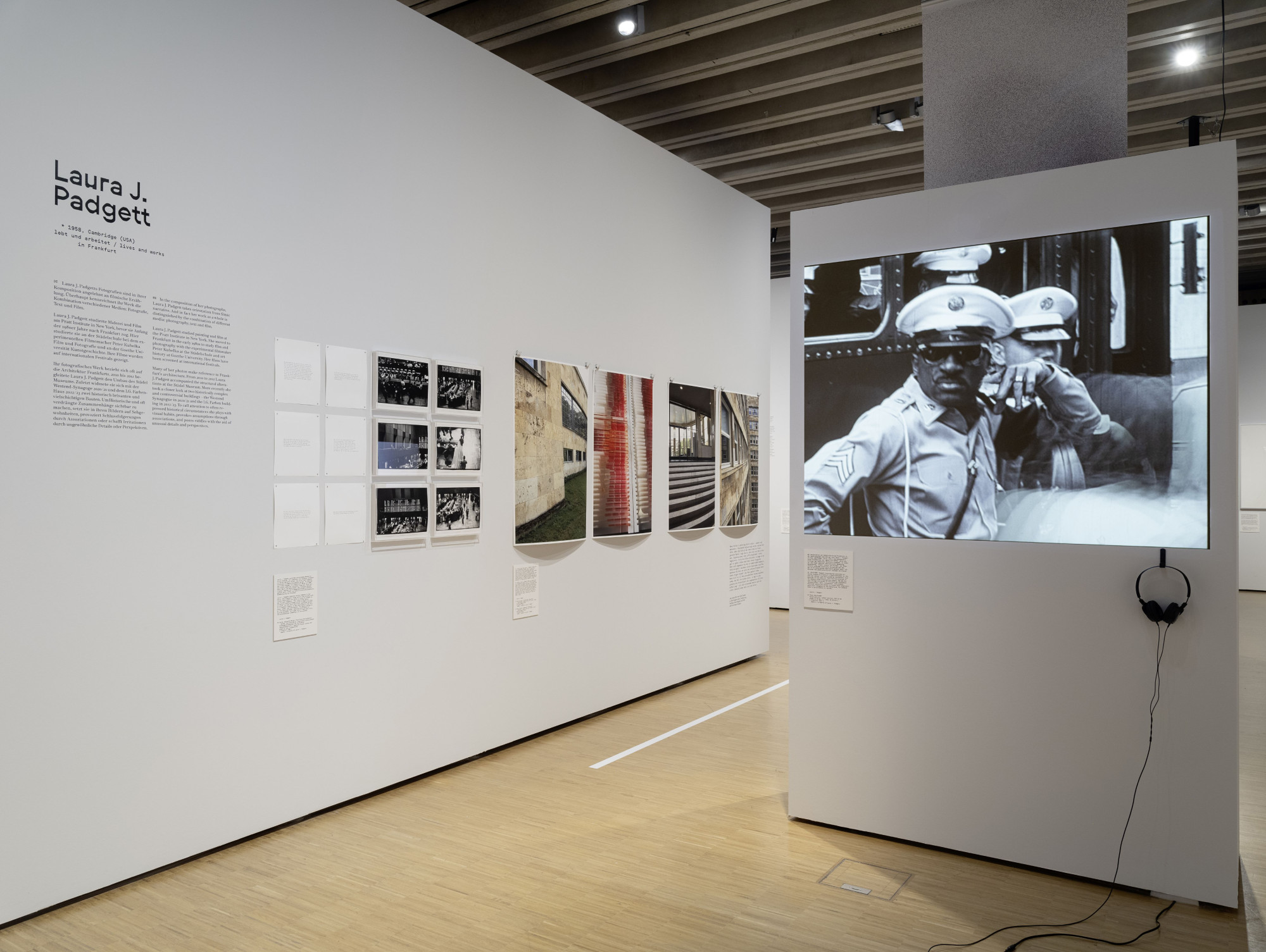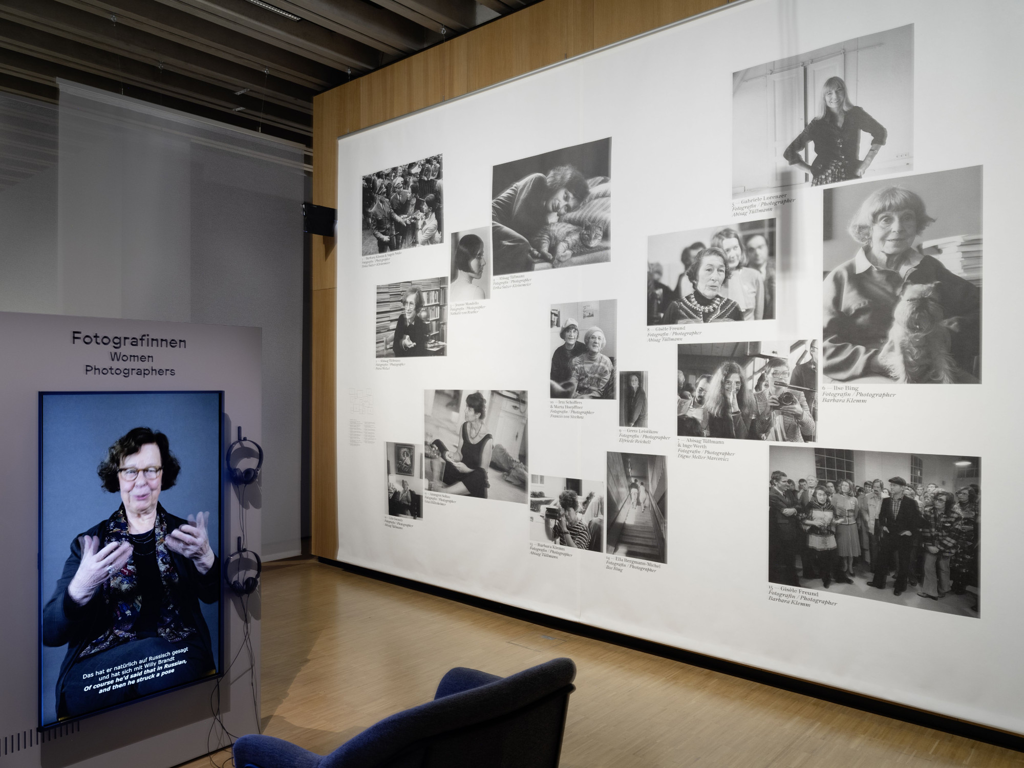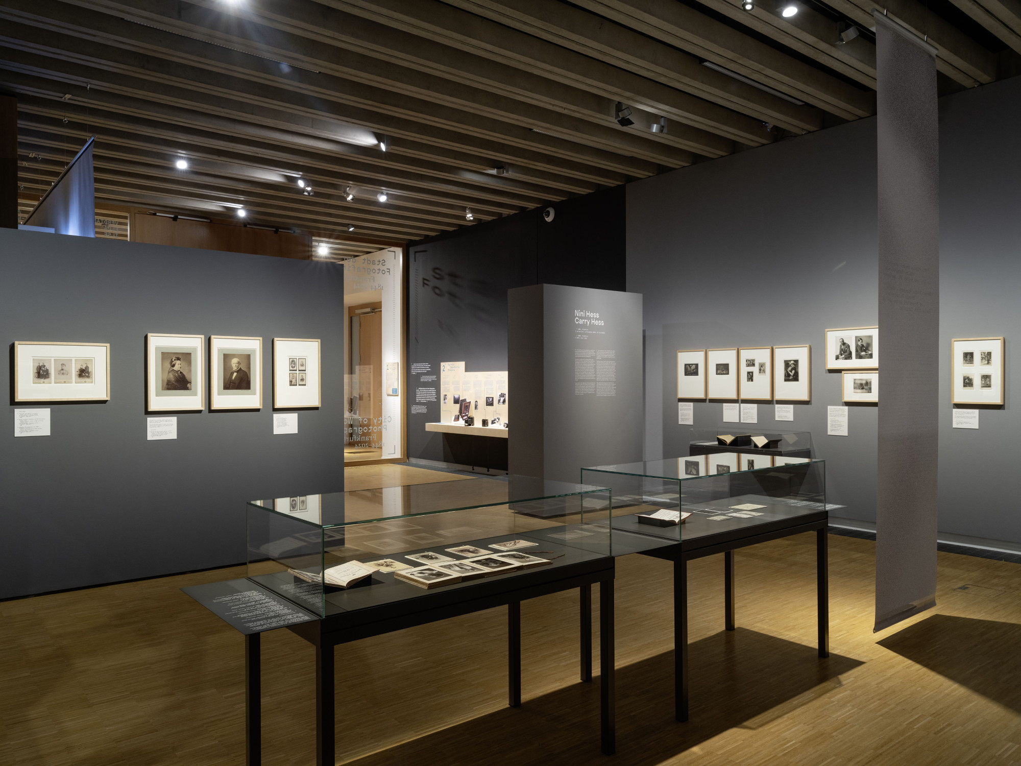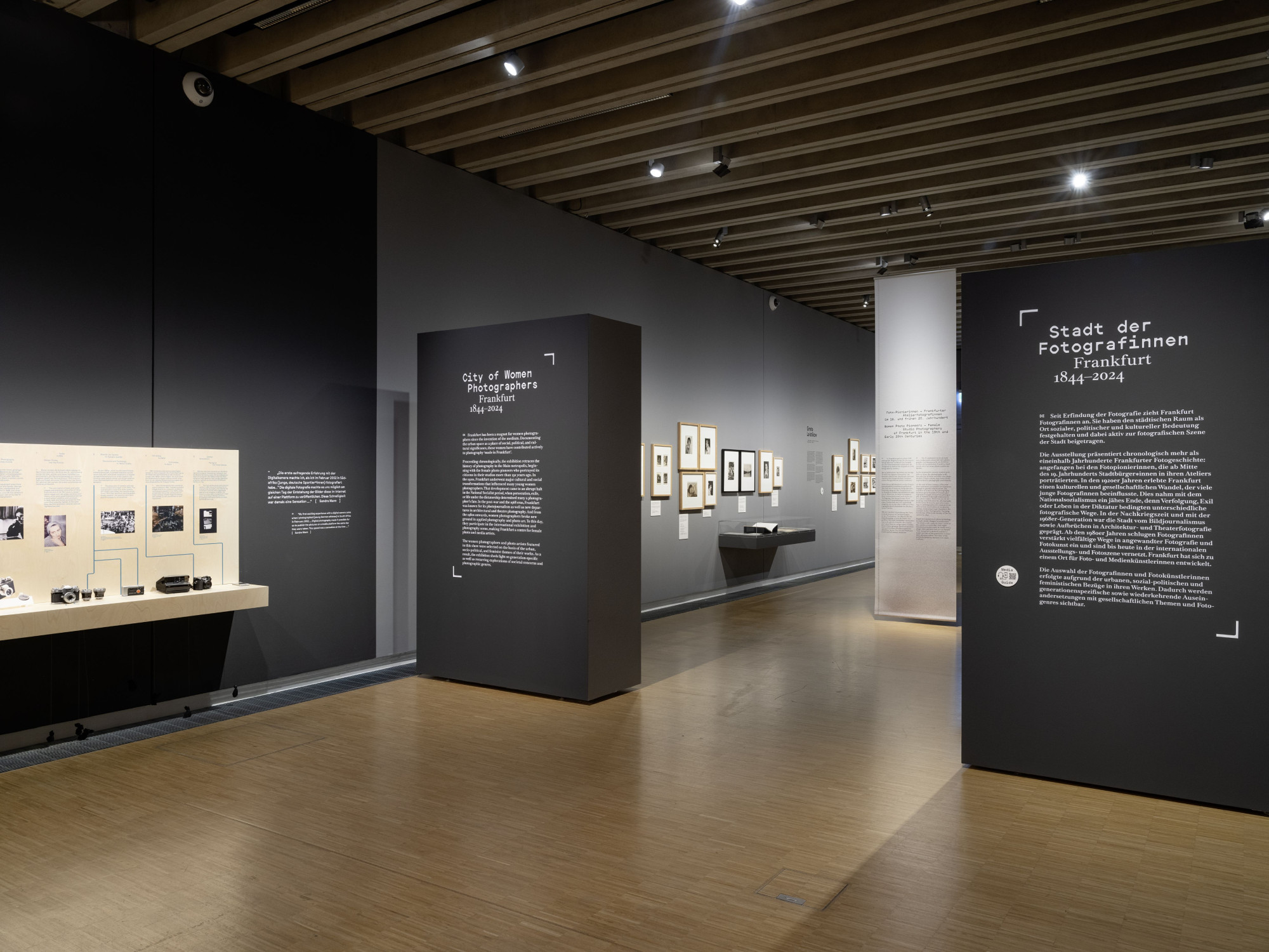 Die Vermittlungsspur, die verschiedene Aspekte der Fotografie durch interaktive Stationen erlebbar macht, hebt sich durch ihre eigene Materialität hervor: Die baulichen Elemente sind aus hellem Holz gefertigt und mit farbiger Schrift sowie farbigen grafischen Elementen bedruckt. Dieser Kontrast schafft eine reizvolle Ergänzung zur klaren Architektur der Ausstellung.