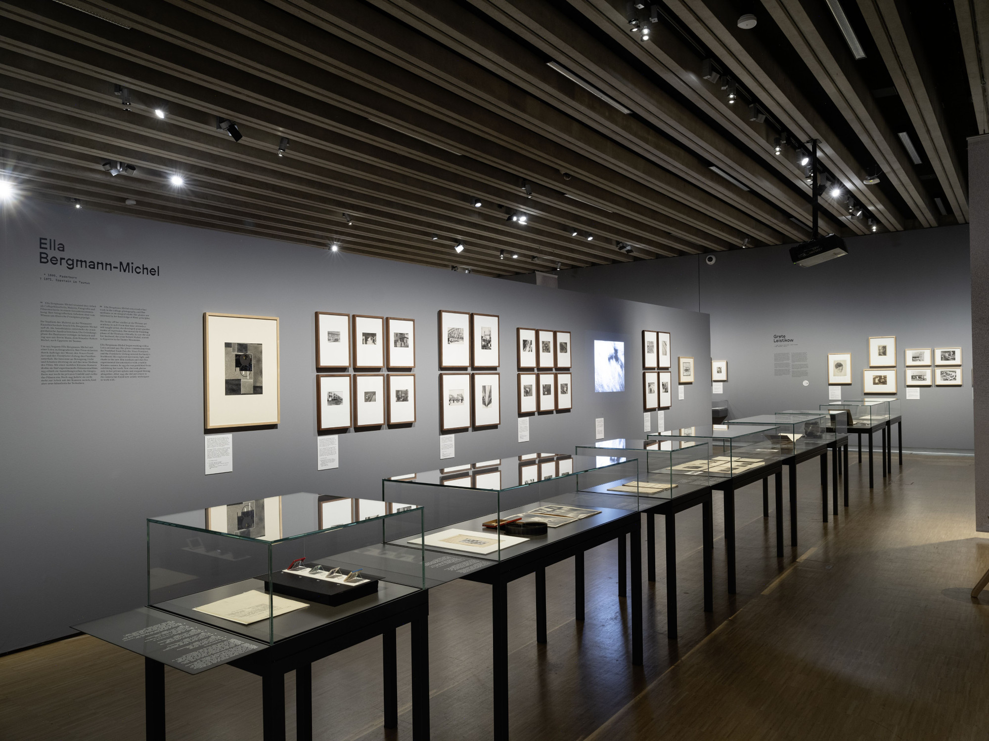 Für die Präsentation von rund 450 Exponaten wurde eine Architektur entwickelt, die sowohl kabinettartige Räume als auch lange Blickachsen nutzt, um eine abwechslungsreiche Dramaturgie zu schaffen. Diese Struktur unterstützt die chronologisch angeordneten Themenschwerpunkte und den vielfältigen Exponatbestand. Das Farbkonzept orientiert sich am Graukeil aus der Schwarz-Weiß-Fotografie und hilft dabei, die verschiedenen Bereiche visuell zu gliedern.