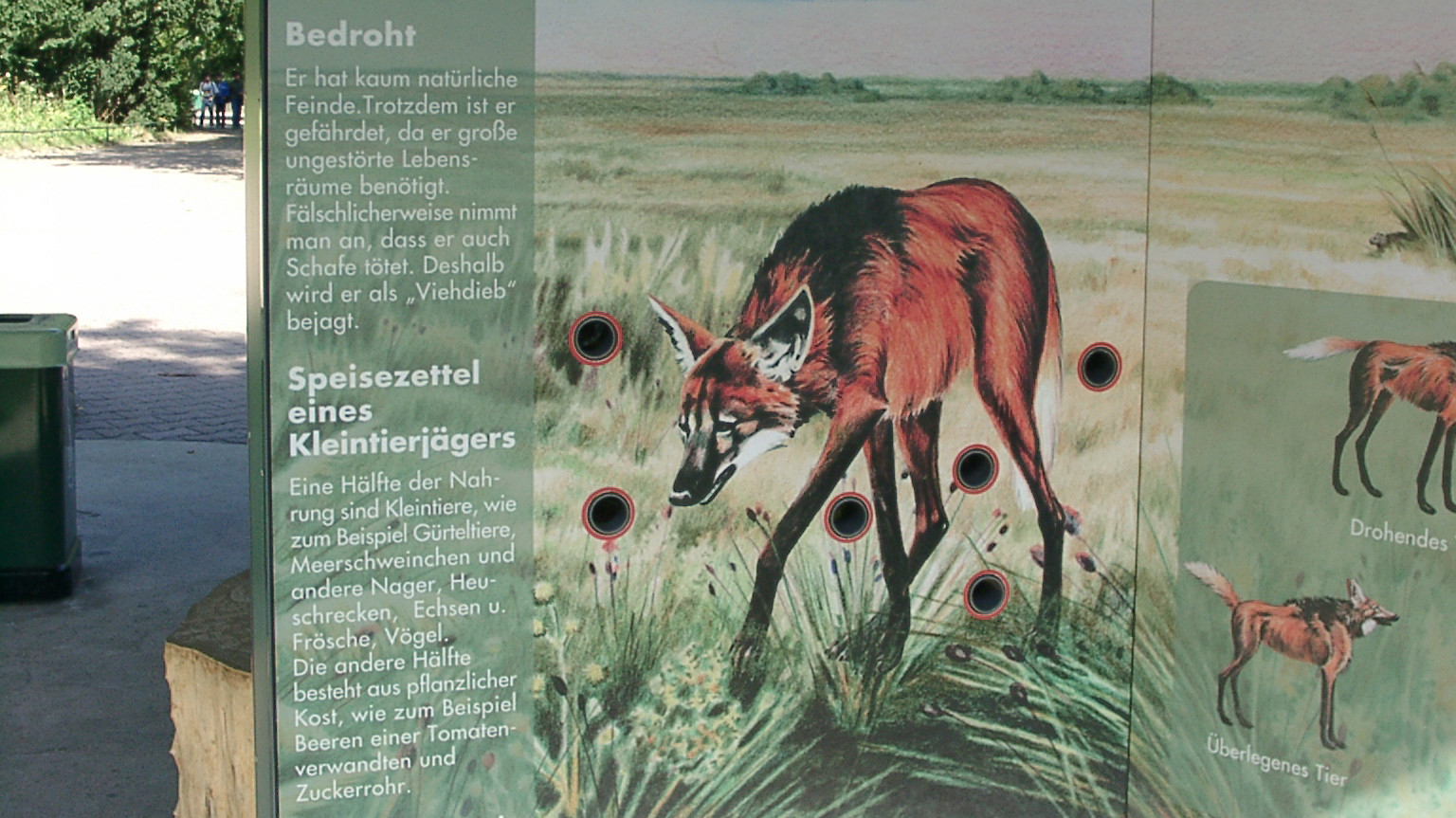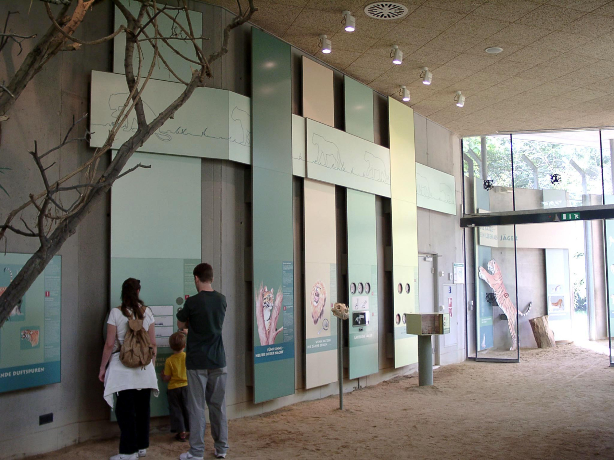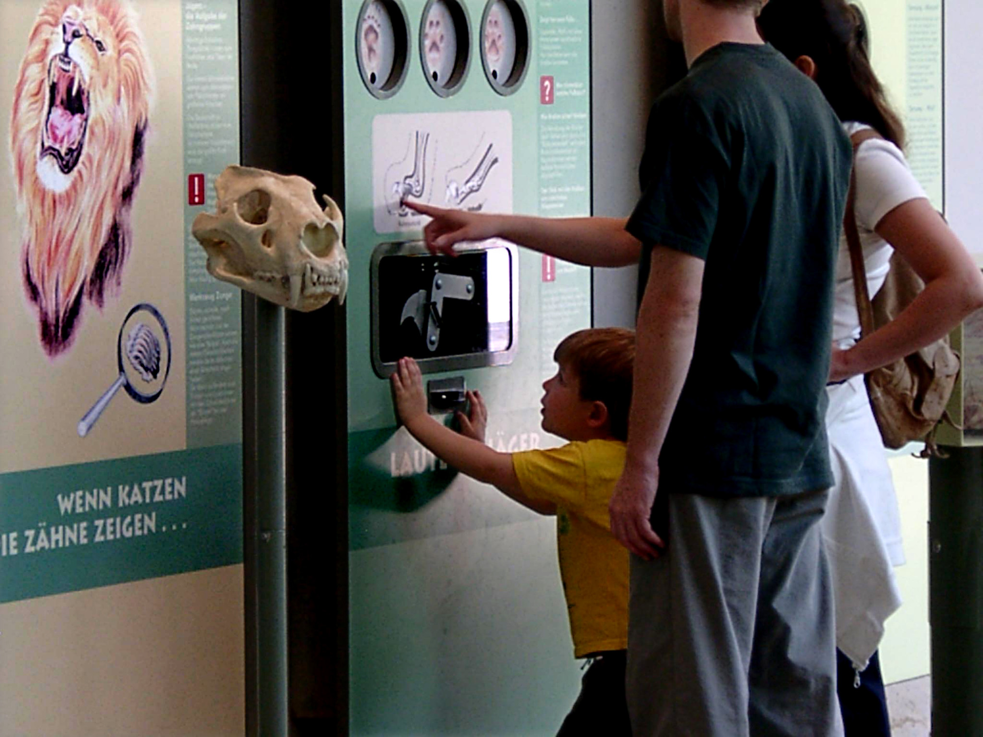 Seit dem Jahr 2000 haben wir gemeinsam mit der Zoopädagogin ein Informationssystem für den Zoo Frankfurt entwickelt. Es umfasst Tafeln, die über den Körperbau, das Verhalten und die Lebensräume der Tiere sowie über Naturschutzthemen informieren. Die Tafeln werden mit interaktiven Objekten kombiniert, die komplexe Zusammenhänge auf spielerische Weise veranschaulichen. Die Besucher:innen können konkrete sinnliche Erfahrungen sammeln und anhand kleiner eigener Experimente Antworten auf gestellte Fragen finden.